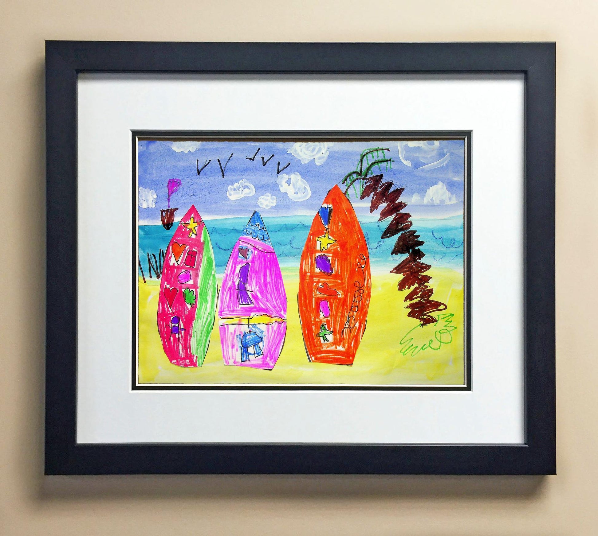 Included with the purchase is the Students Artwork, Frame, double matboard, shatter proof plexiglass, and a ready to hang backerboard with turnbuttons