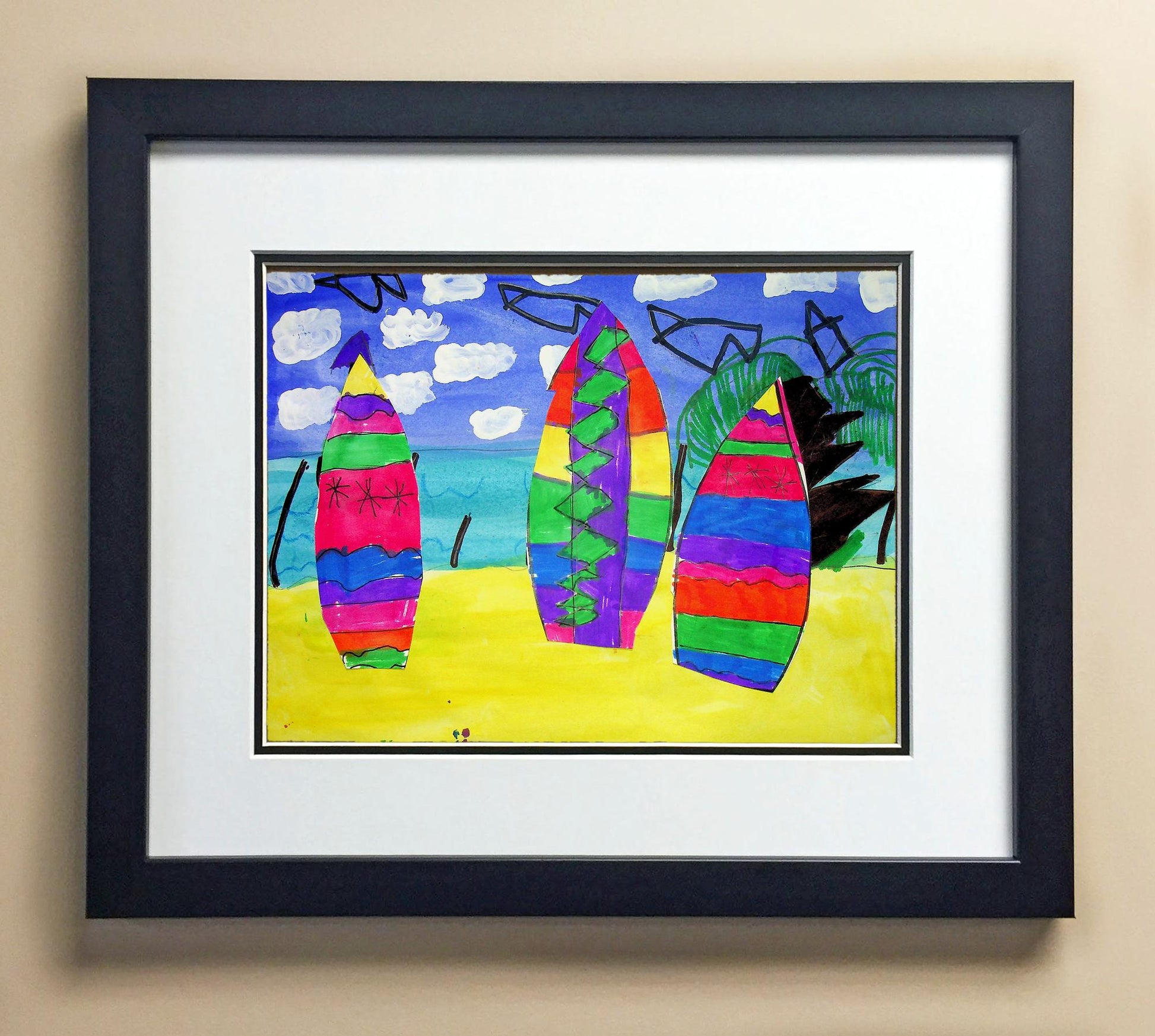 Included with the purchase is the Students Artwork, Frame, double matboard, shatter proof plexiglass, and a ready to hang backerboard with turnbuttons