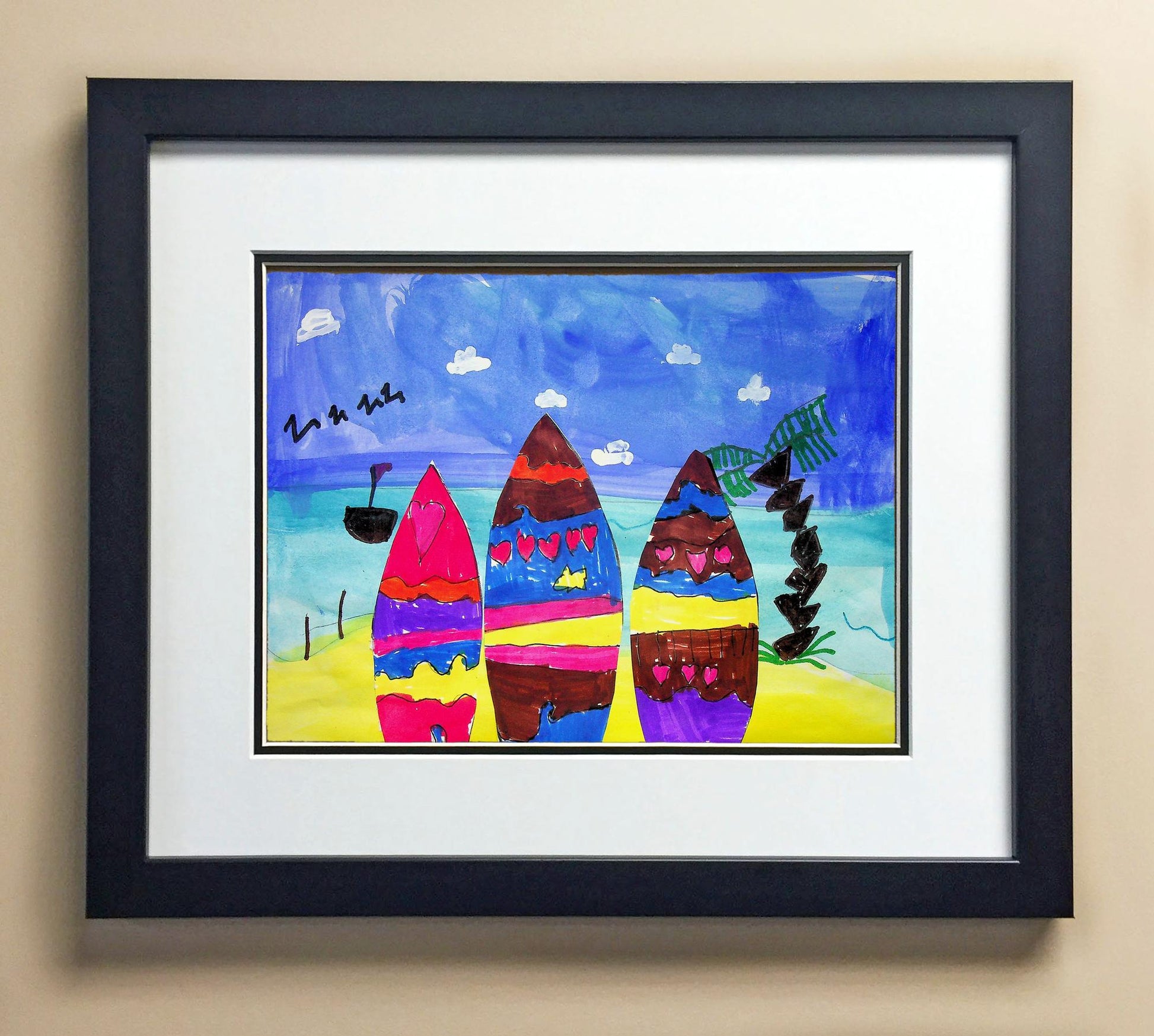Included with the purchase is the Students Artwork, Frame, double matboard, shatter proof plexiglass, and a ready to hang backerboard with turnbuttons