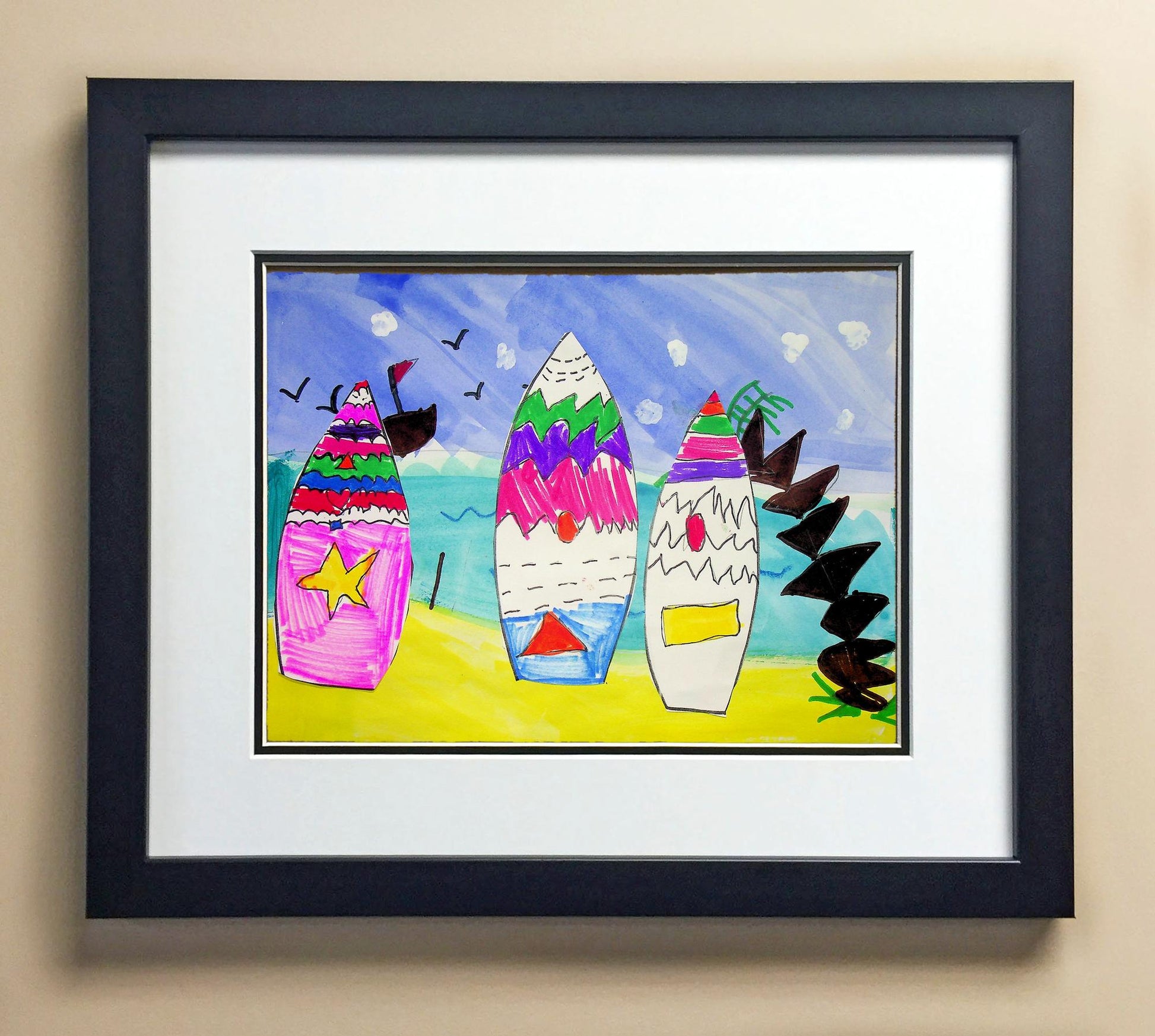 Included with the purchase is the Students Artwork, Frame, double matboard, shatter proof plexiglass, and a ready to hang backerboard with turnbuttons