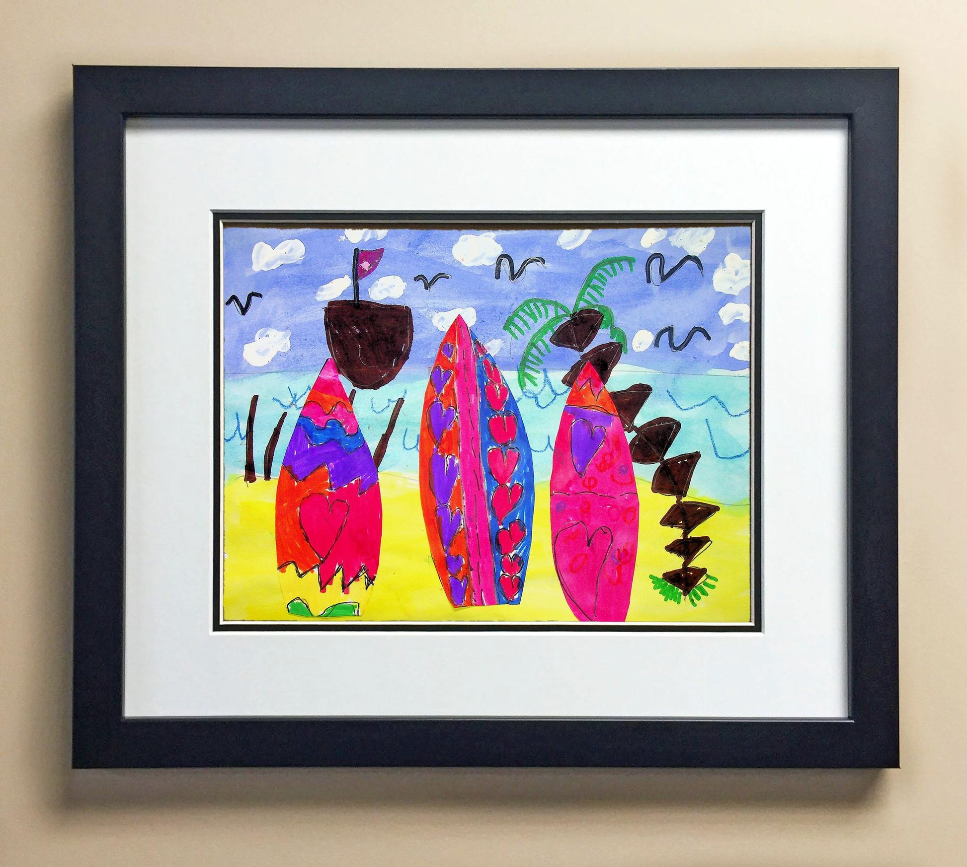 Included with the purchase is the Students Artwork, Frame, double matboard, shatter proof plexiglass, and a ready to hang backerboard with turnbuttons