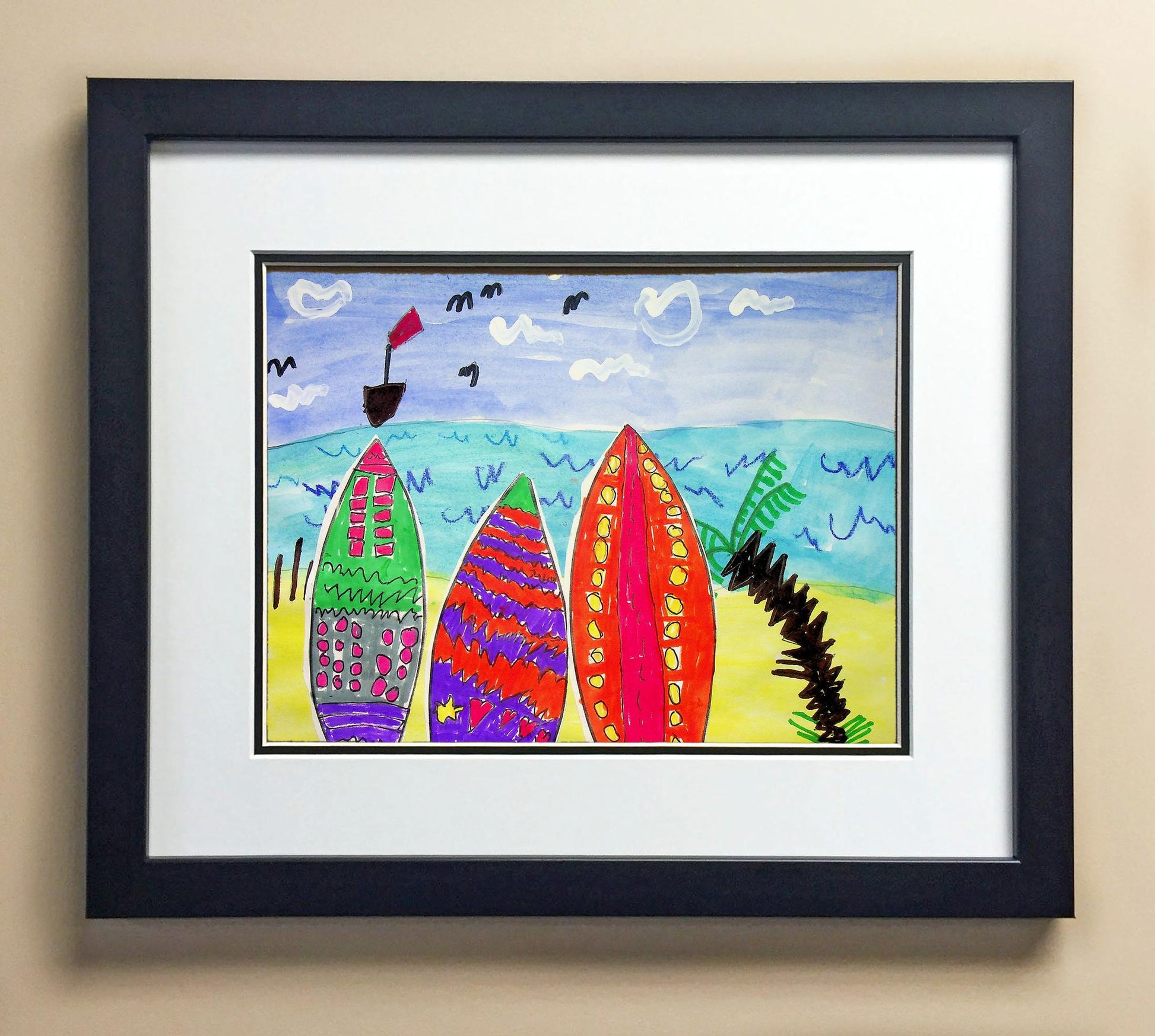 Included with the purchase is the Students Artwork, Frame, double matboard, shatter proof plexiglass, and a ready to hang backerboard with turnbuttons