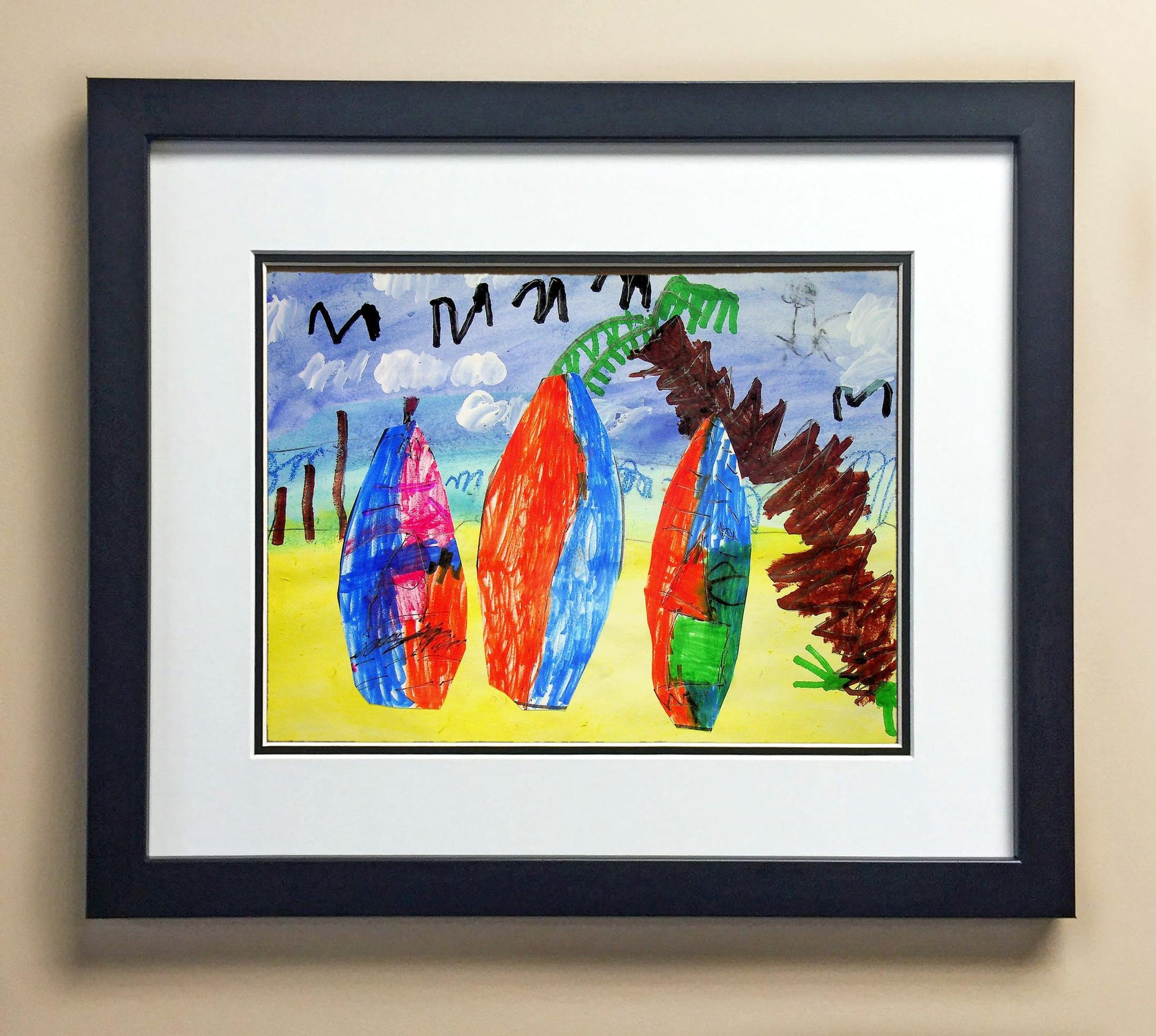 Included with the purchase is the Students Artwork, Frame, double matboard, shatter proof plexiglass, and a ready to hang backerboard with turnbuttons