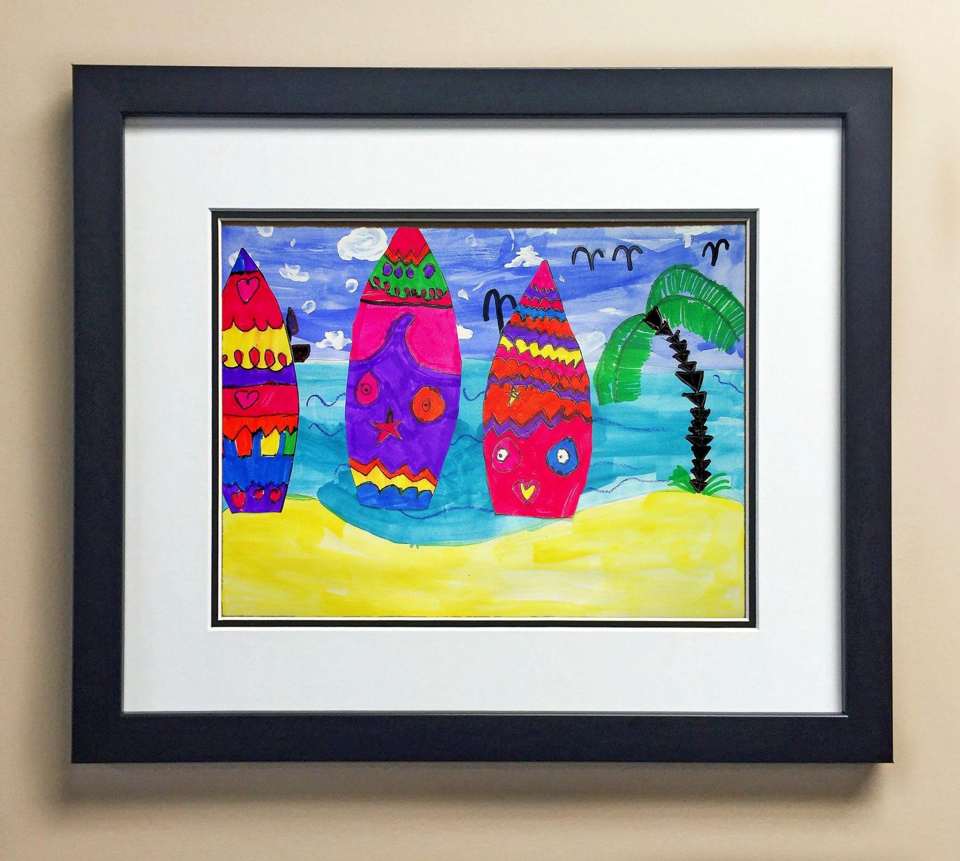Included with the purchase is the Students Artwork, Frame, double matboard, shatter proof plexiglass, and a ready to hang backerboard with turnbuttons