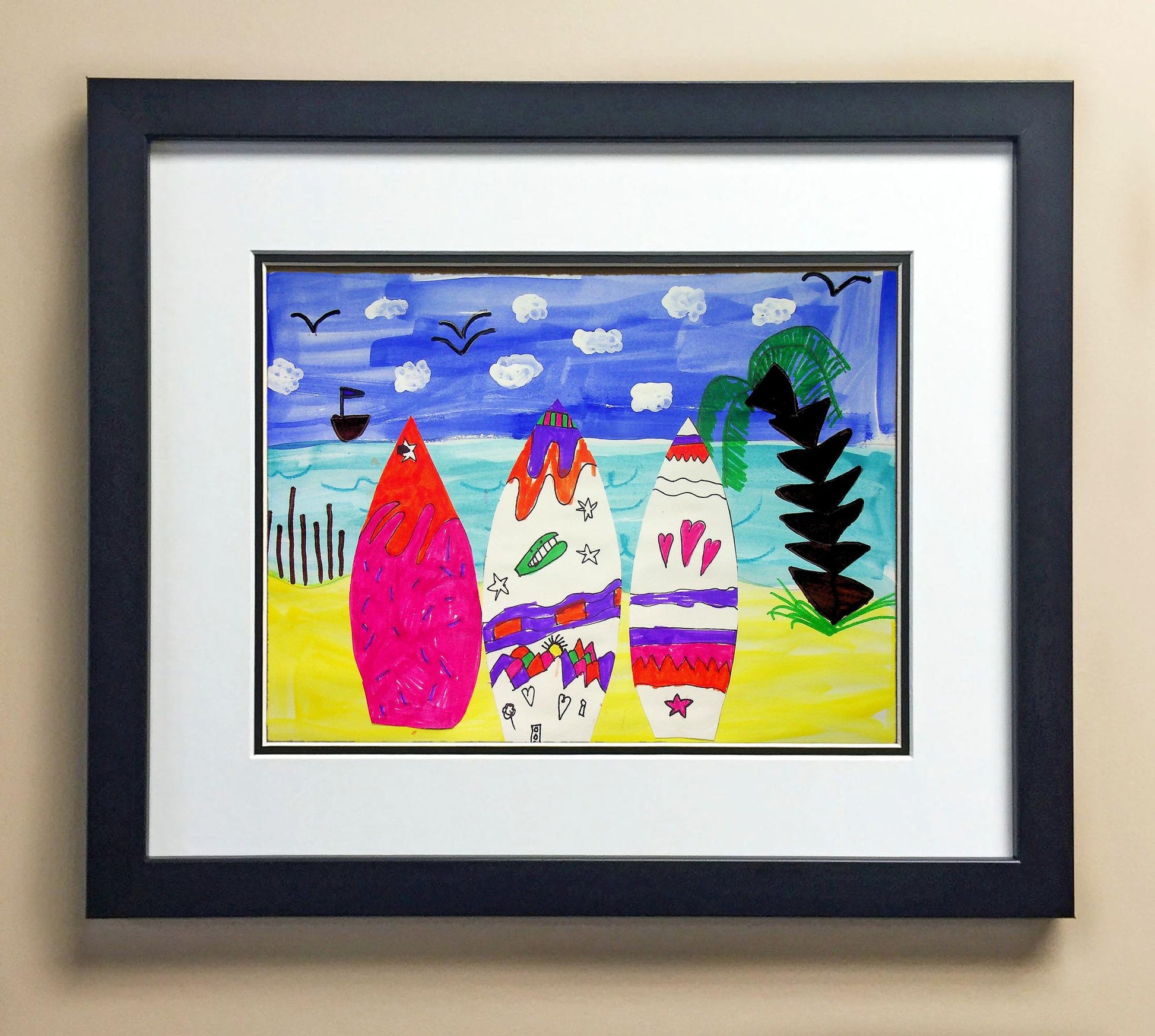Included with the purchase is the Students Artwork, Frame, double matboard, shatter proof plexiglass, and a ready to hang backerboard with turnbuttons