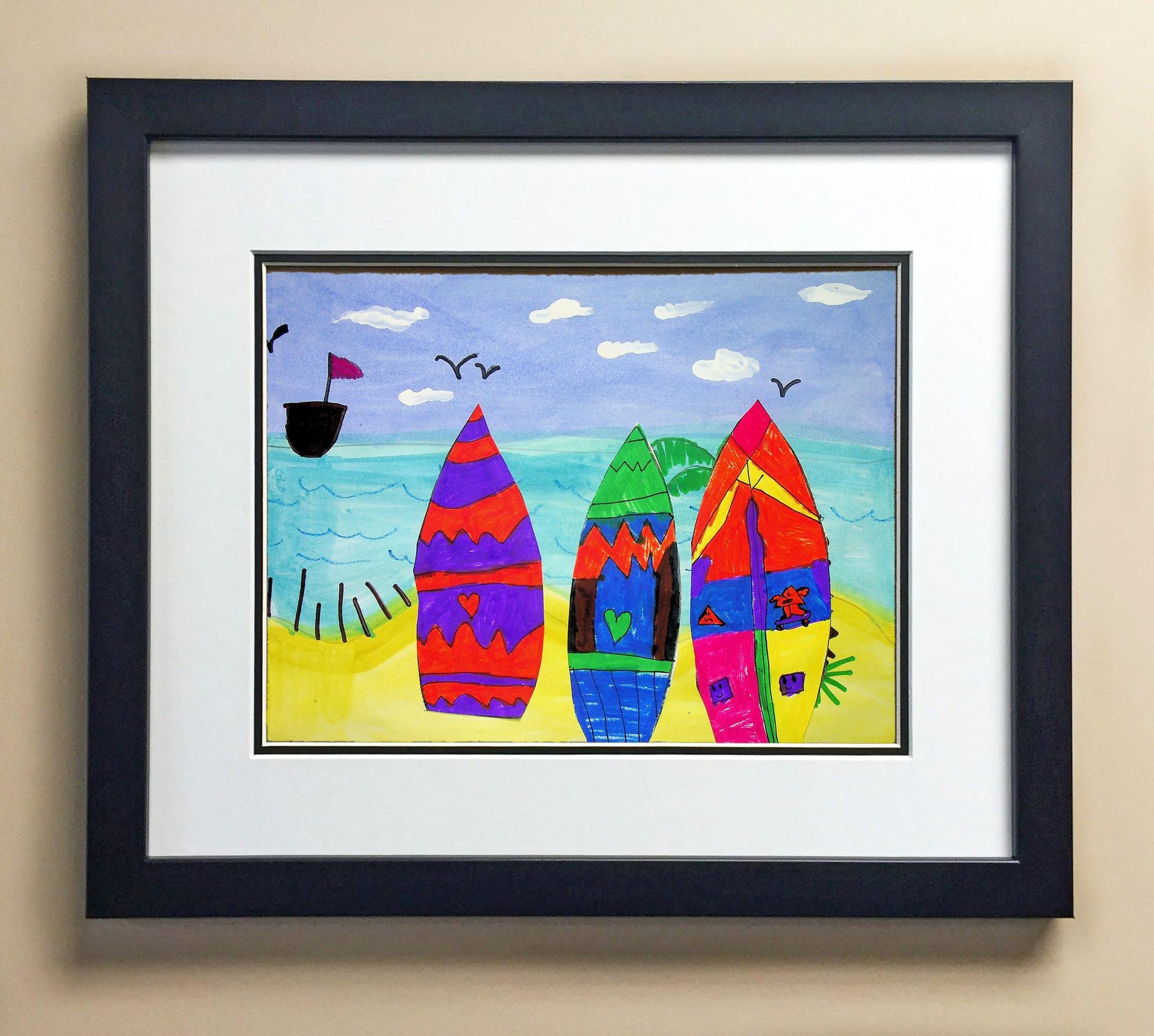 Included with the purchase is the Students Artwork, Frame, double matboard, shatter proof plexiglass, and a ready to hang backerboard with turnbuttons