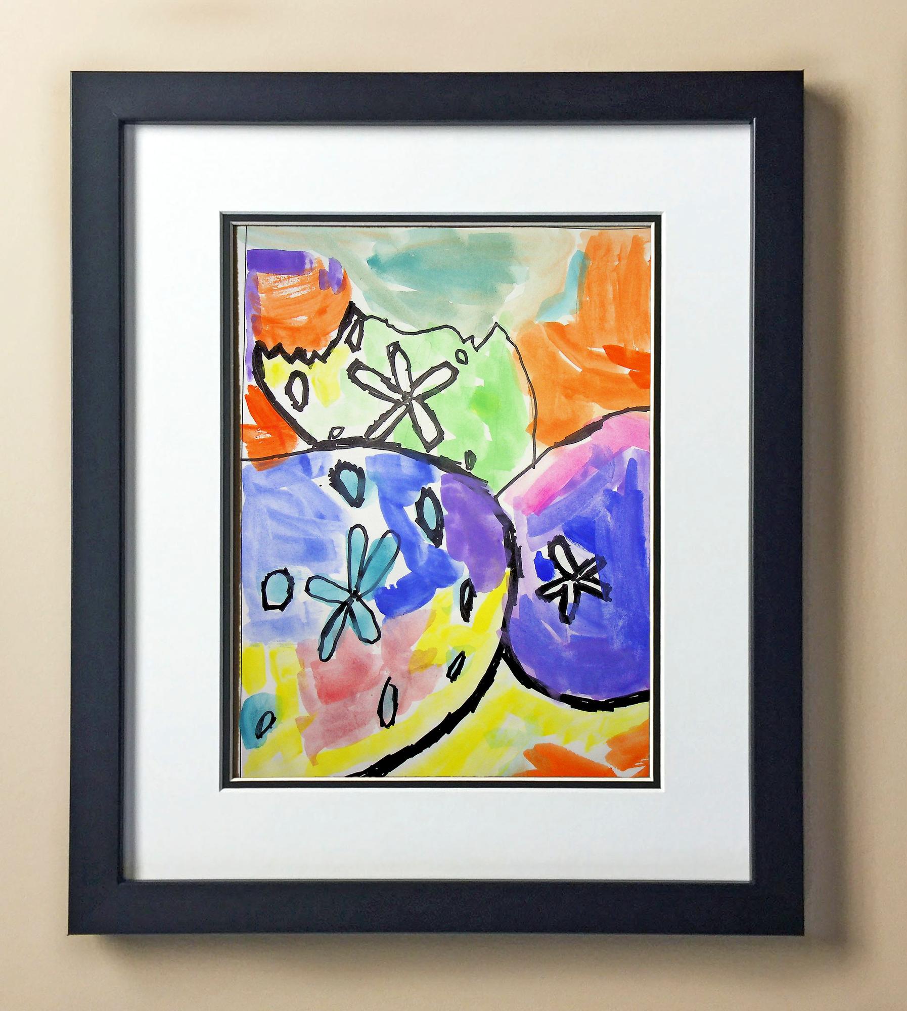 Included with the purchase is the Students Artwork, Frame, double matboard, shatter proof plexiglass, and a ready to hang backerboard with turnbuttons