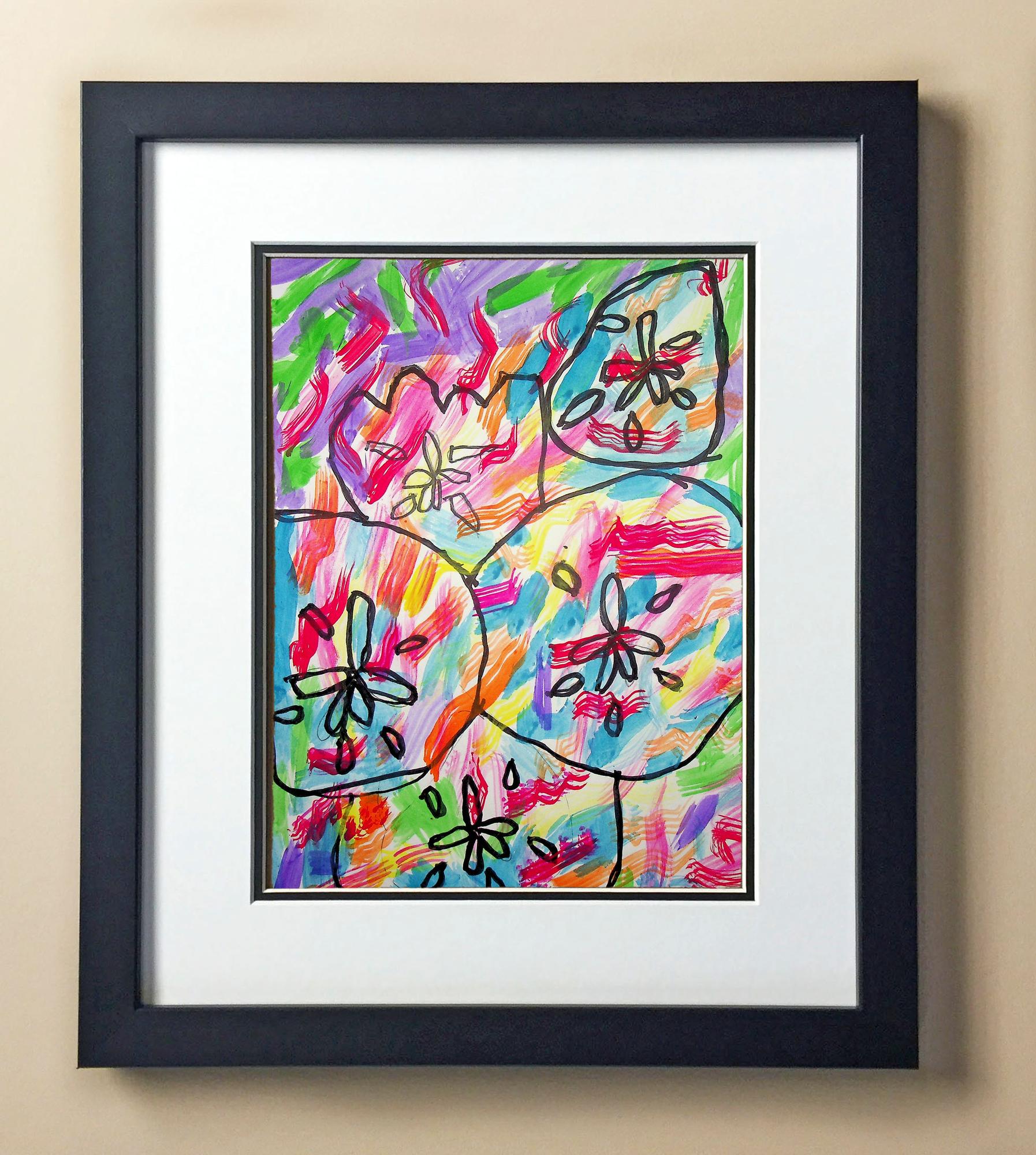 Included with the purchase is the Students Artwork, Frame, double matboard, shatter proof plexiglass, and a ready to hang backerboard with turnbuttons