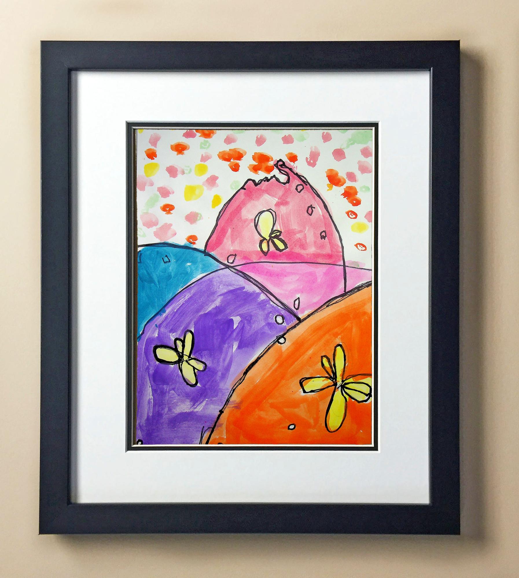 Included with the purchase is the Students Artwork, Frame, double matboard, shatter proof plexiglass, and a ready to hang backerboard with turnbuttons