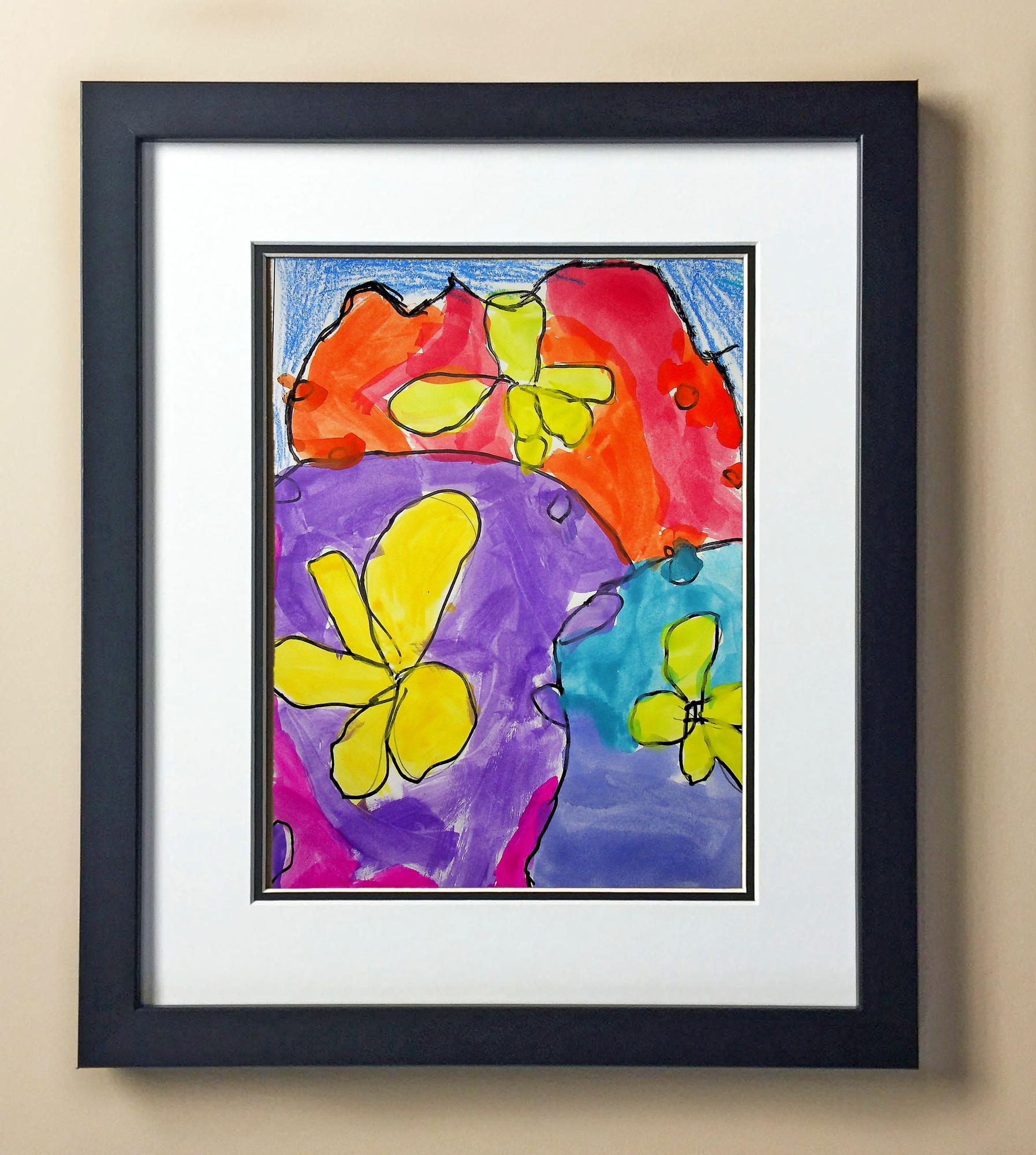 Included with the purchase is the Students Artwork, Frame, double matboard, shatter proof plexiglass, and a ready to hang backerboard with turnbuttons