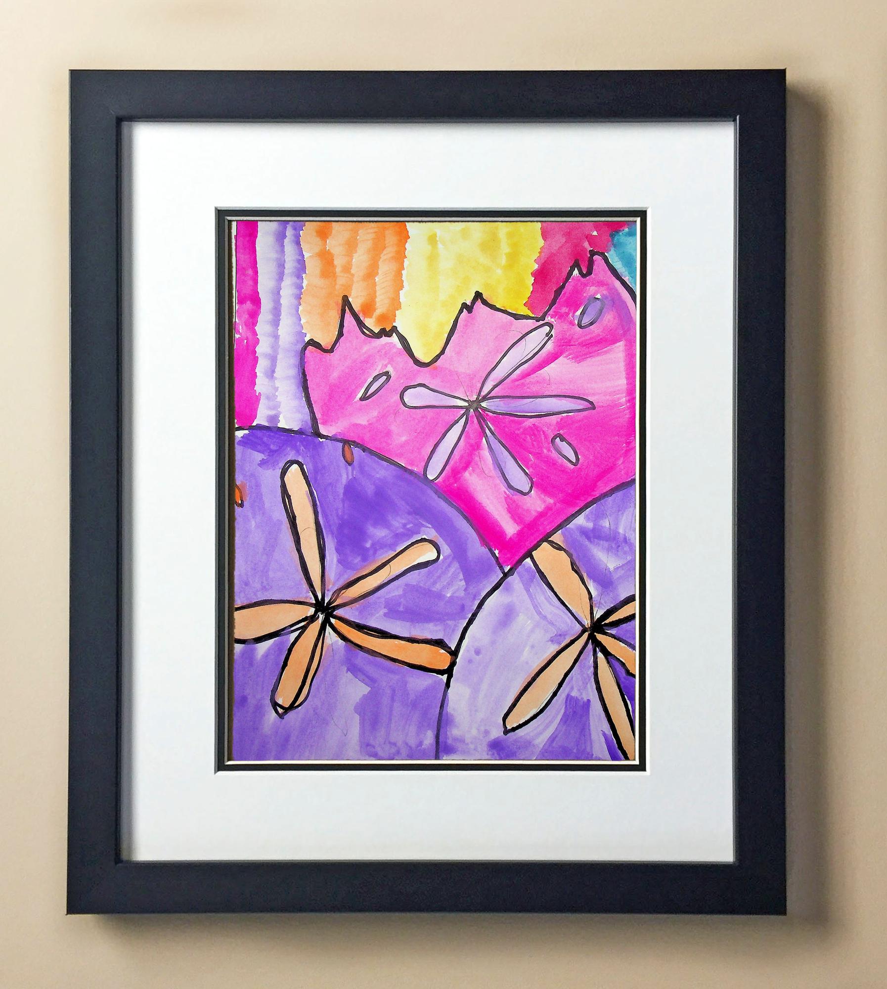 Included with the purchase is the Students Artwork, Frame, double matboard, shatter proof plexiglass, and a ready to hang backerboard with turnbuttons