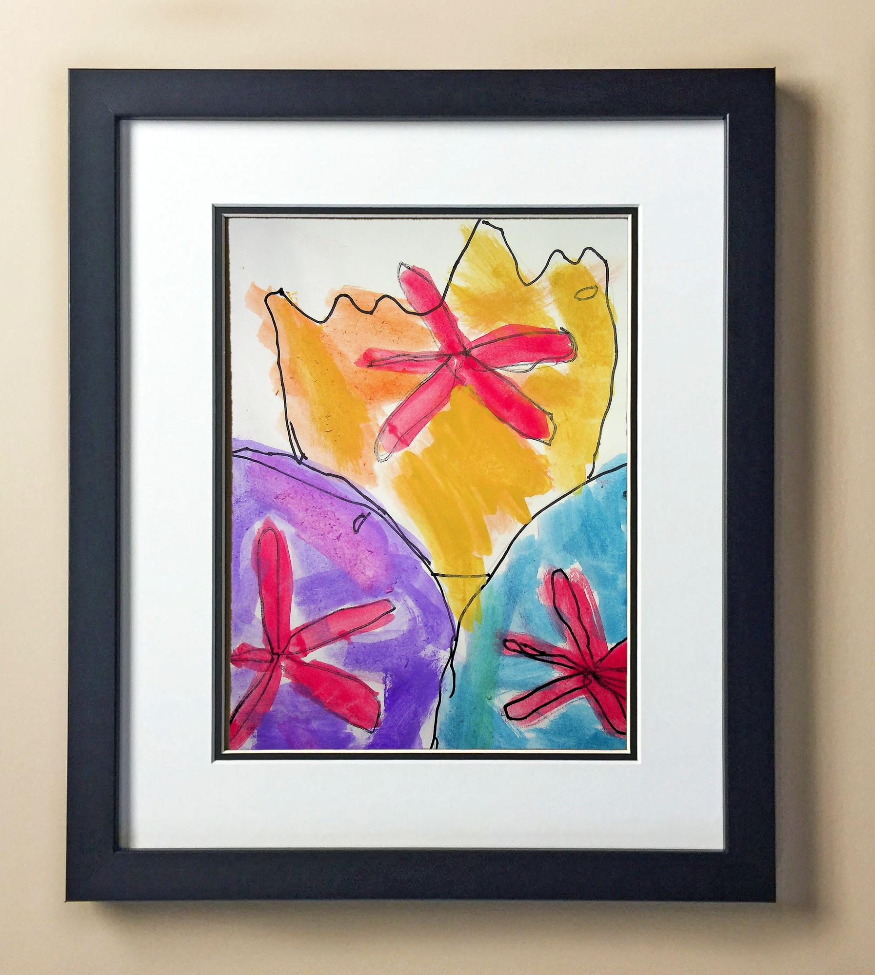 Included with the purchase is the Students Artwork, Frame, double matboard, shatter proof plexiglass, and a ready to hang backerboard with turnbuttons