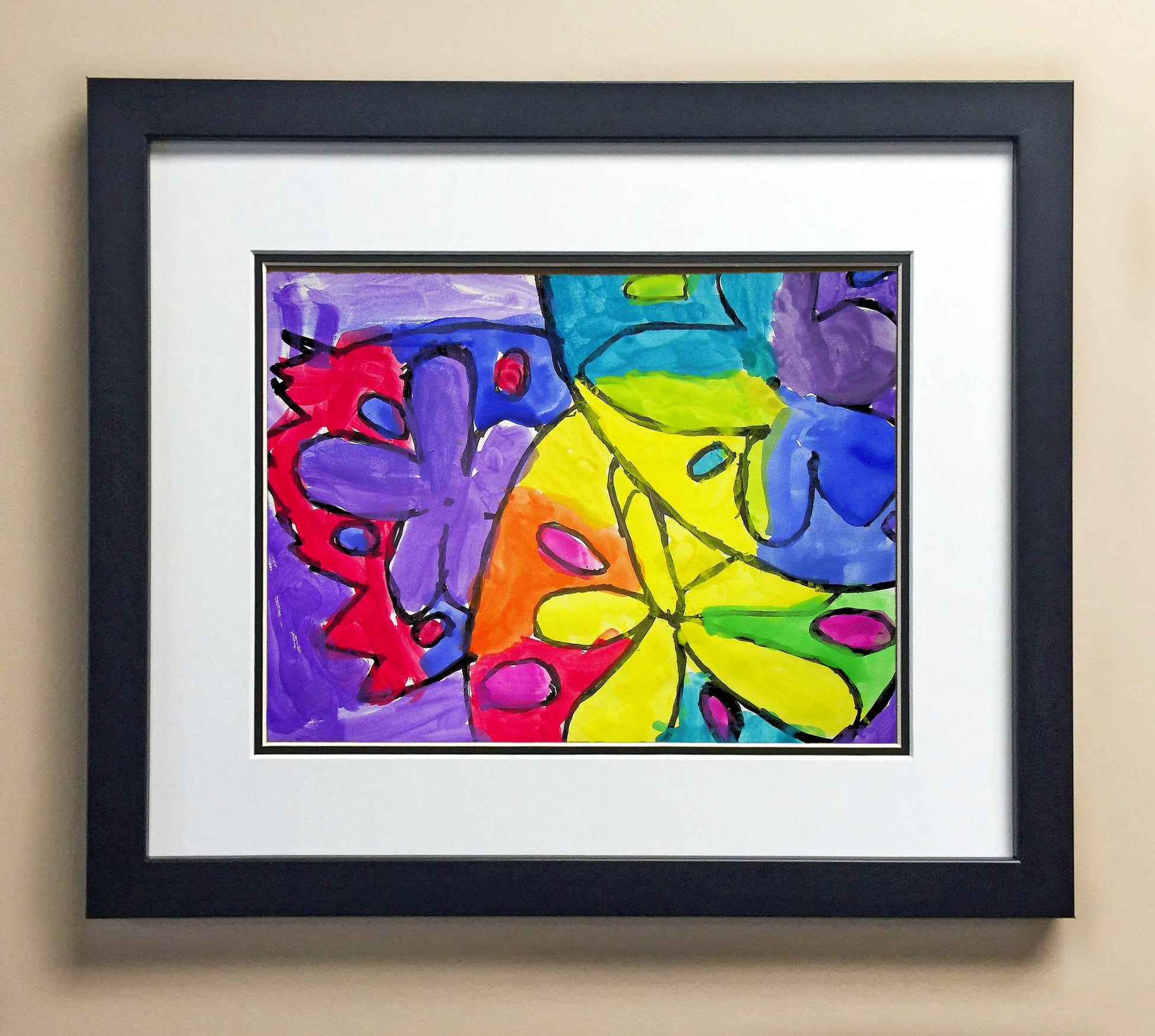 Included with the purchase is the Students Artwork, Frame, double matboard, shatter proof plexiglass, and a ready to hang backerboard with turnbuttons