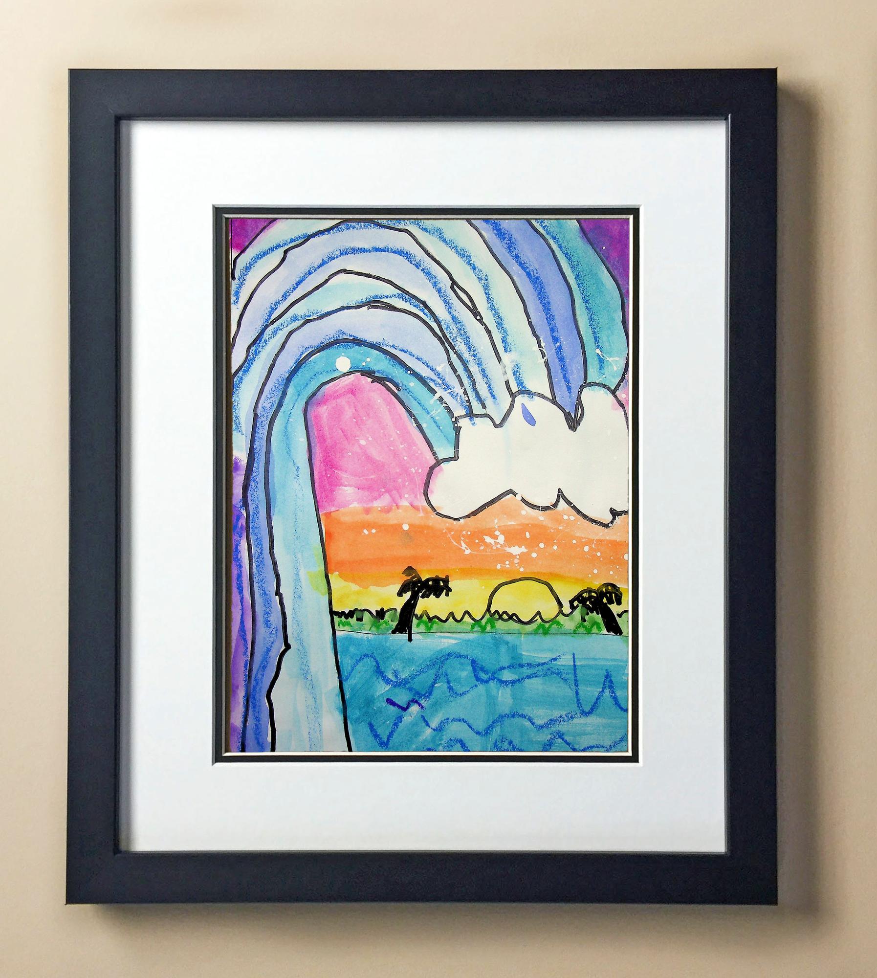 Included with the purchase is the Students Artwork, Frame, double matboard, shatter proof plexiglass, and a ready to hang backerboard with turnbuttons