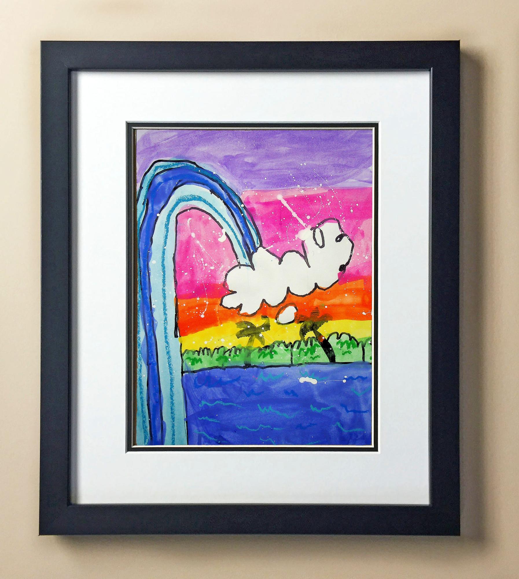 Included with the purchase is the Students Artwork, Frame, double matboard, shatter proof plexiglass, and a ready to hang backerboard with turnbuttons
