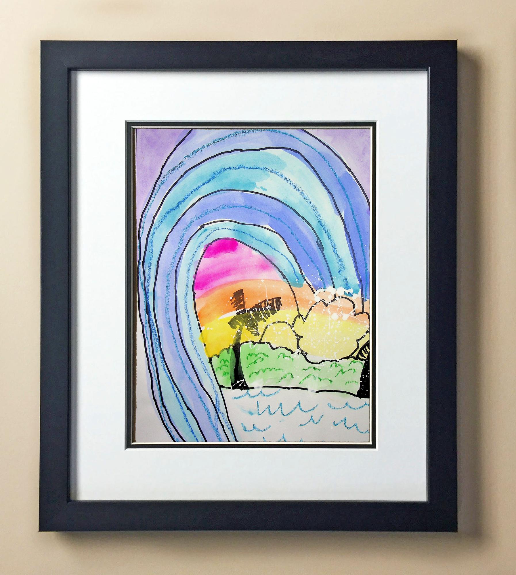 Included with the purchase is the Students Artwork, Frame, double matboard, shatter proof plexiglass, and a ready to hang backerboard with turnbuttons