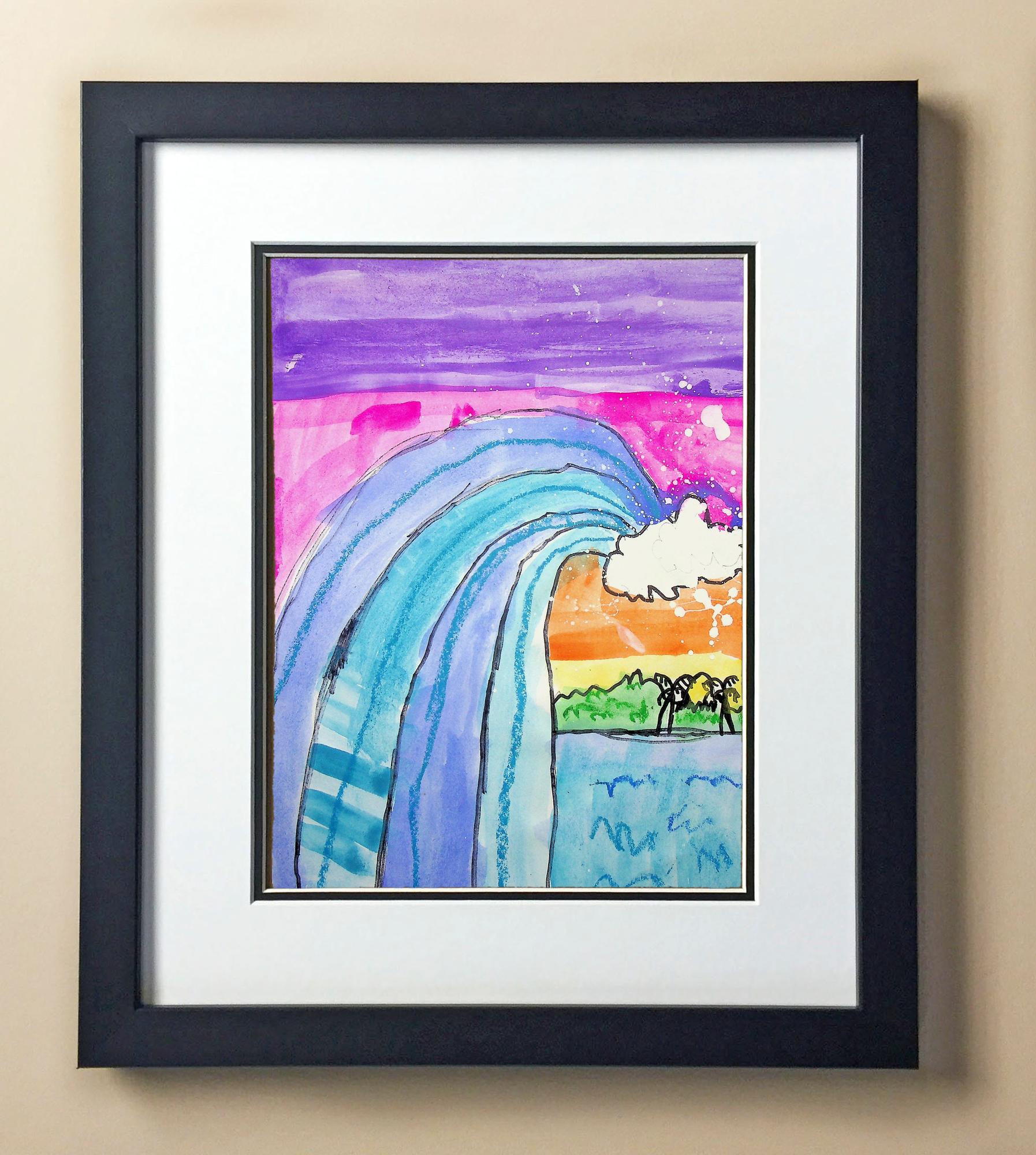 Included with the purchase is the Students Artwork, Frame, double matboard, shatter proof plexiglass, and a ready to hang backerboard with turnbuttons