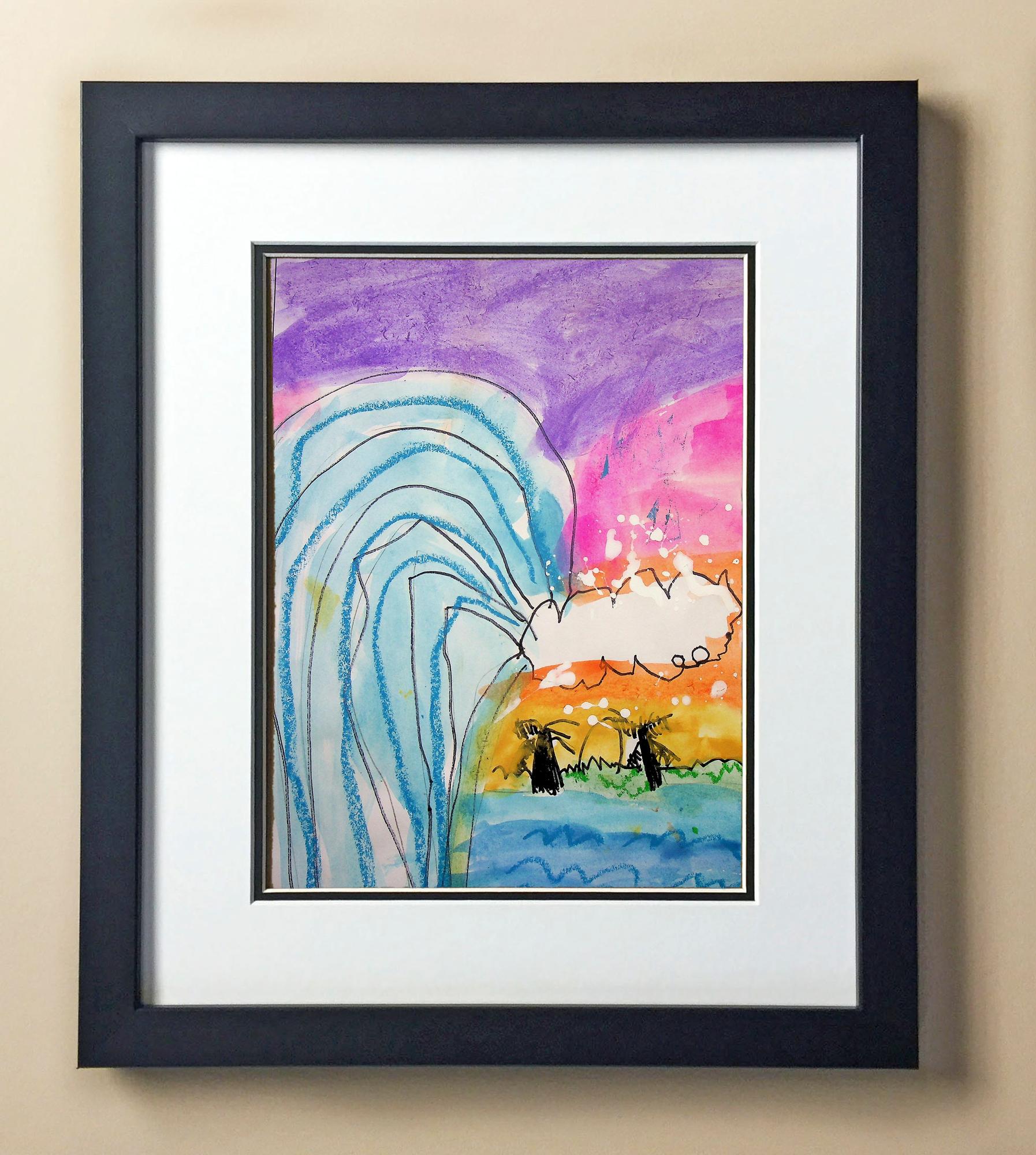 Included with the purchase is the Students Artwork, Frame, double matboard, shatter proof plexiglass, and a ready to hang backerboard with turnbuttons