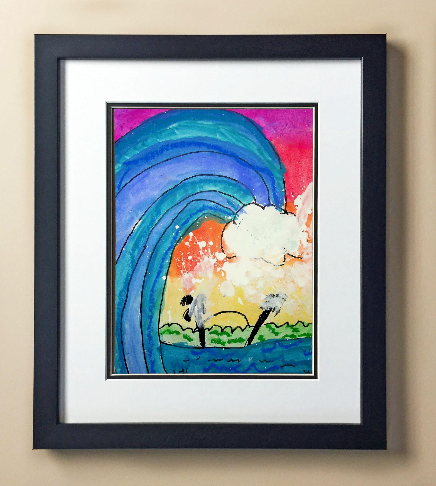 Included with the purchase is the Students Artwork, Frame, double matboard, shatter proof plexiglass, and a ready to hang backerboard with turnbuttons