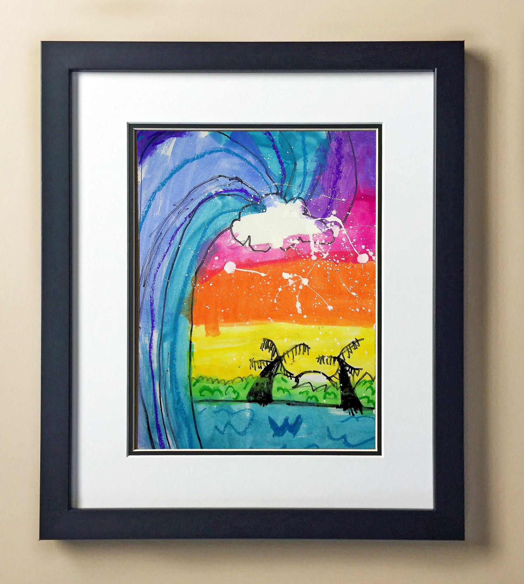 Included with the purchase is the Students Artwork, Frame, double matboard, shatter proof plexiglass, and a ready to hang backerboard with turnbuttons