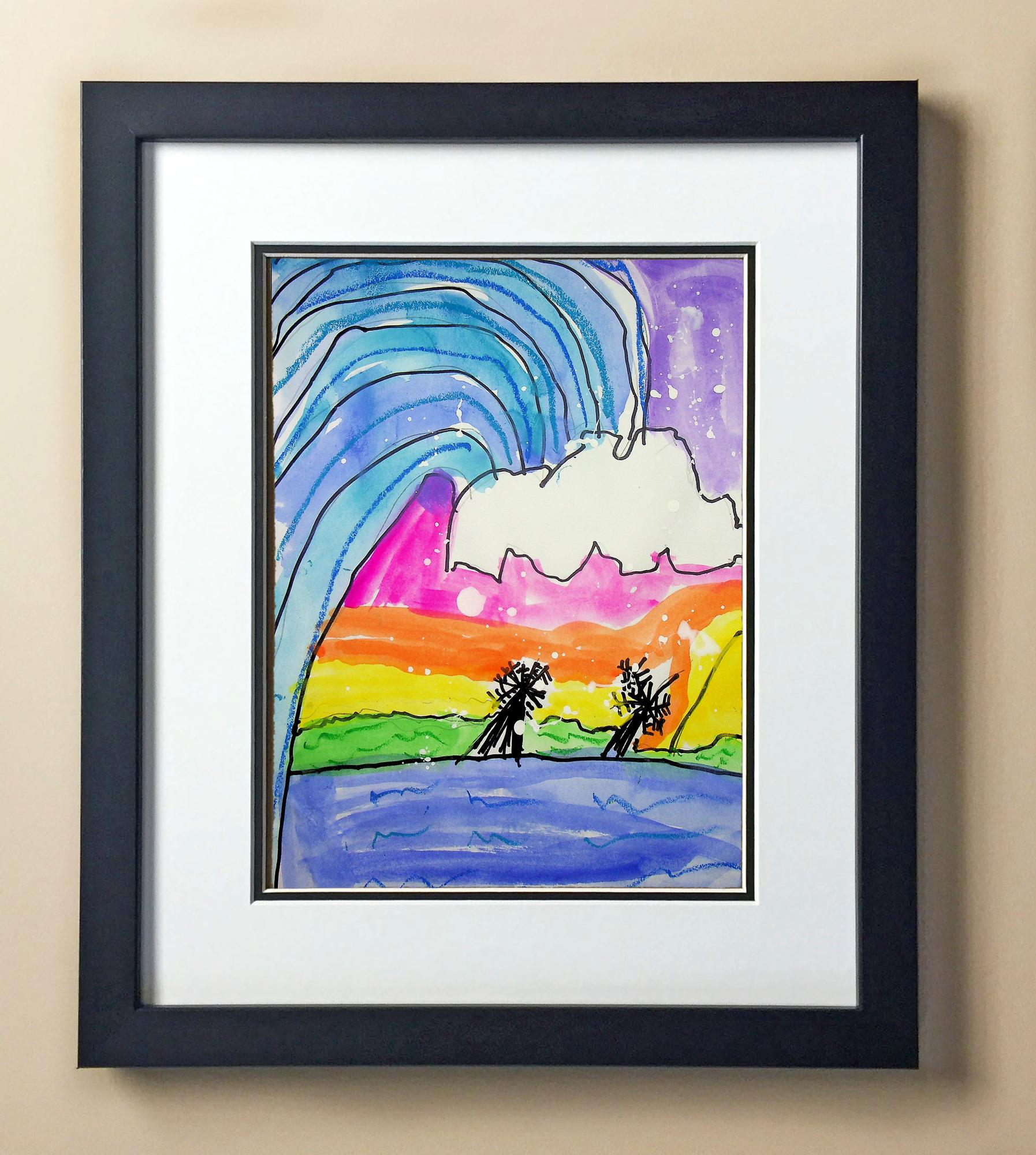 Included with the purchase is the Students Artwork, Frame, double matboard, shatter proof plexiglass, and a ready to hang backerboard with turnbuttons