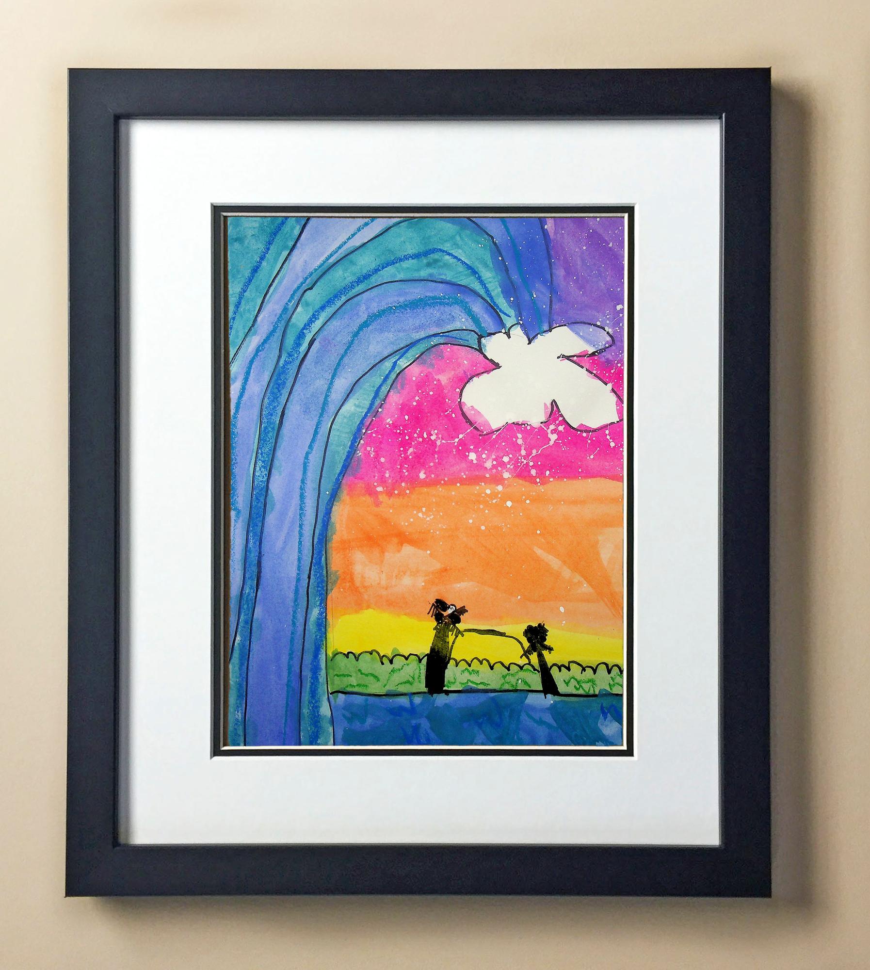 Included with the purchase is the Students Artwork, Frame, double matboard, shatter proof plexiglass, and a ready to hang backerboard with turnbuttons