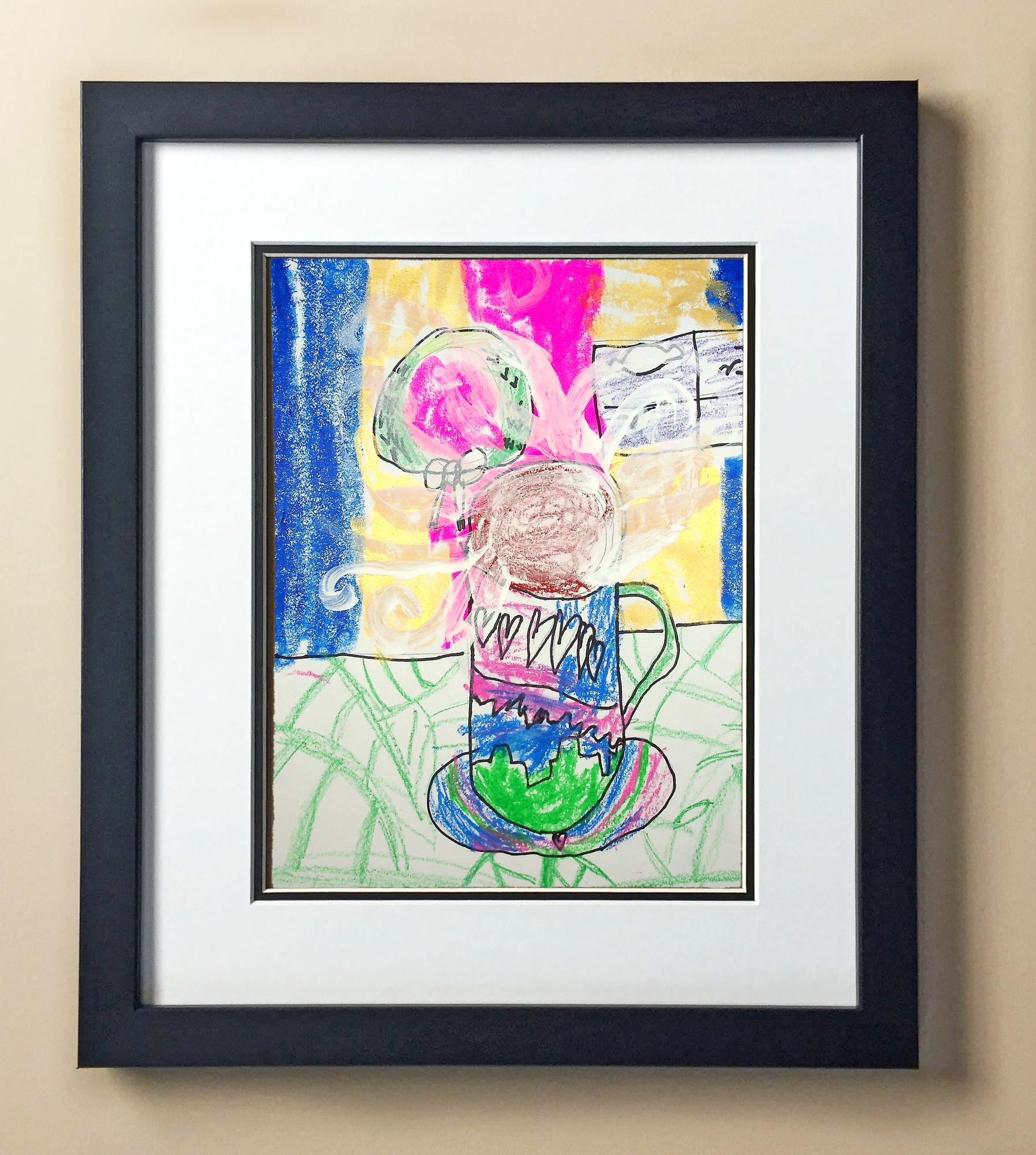Included with the purchase is the Students Artwork, Frame, double matboard, shatter proof plexiglass, and a ready to hang backerboard with turnbuttons