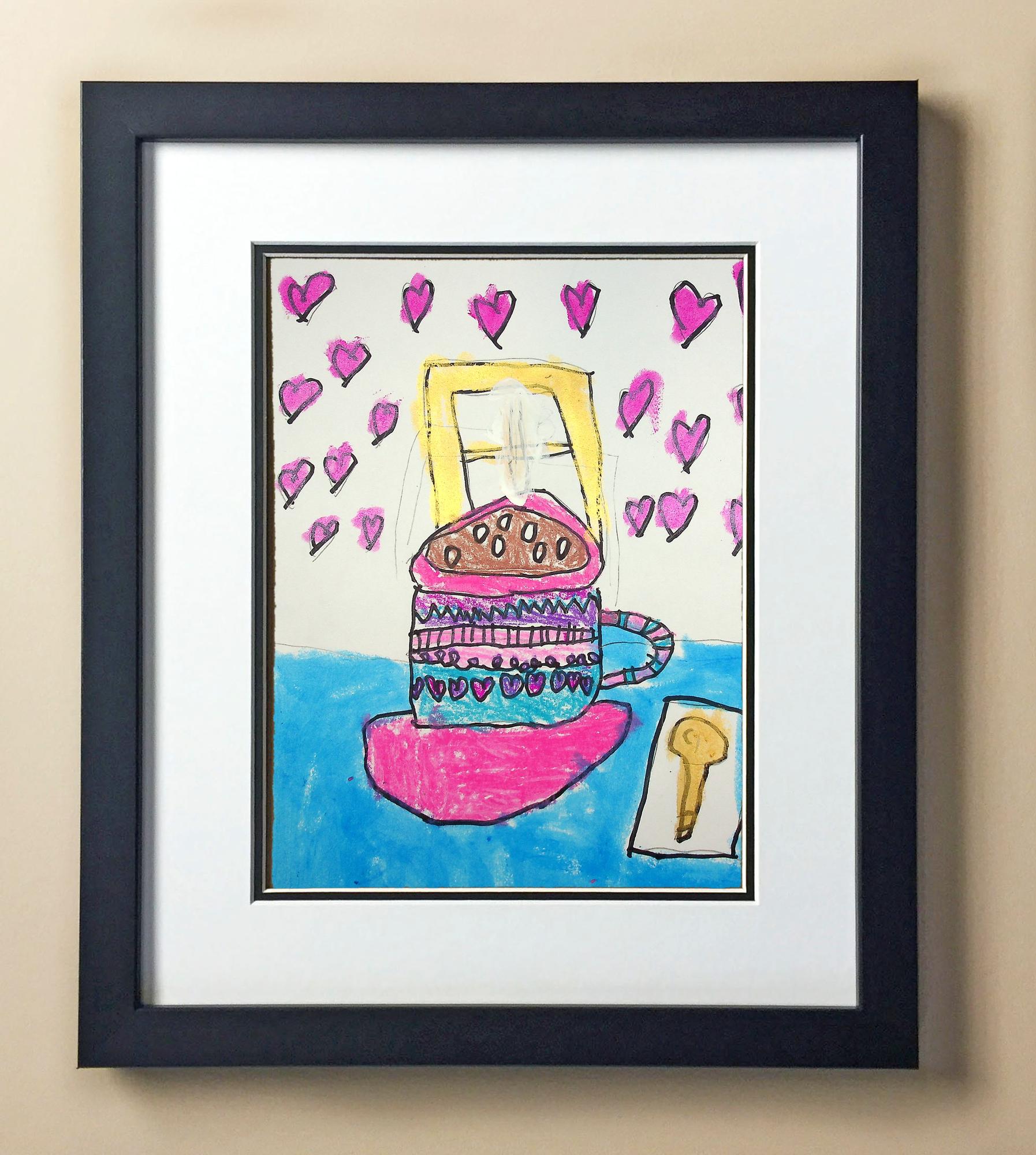 Included with the purchase is the Students Artwork, Frame, double matboard, shatter proof plexiglass, and a ready to hang backerboard with turnbuttons