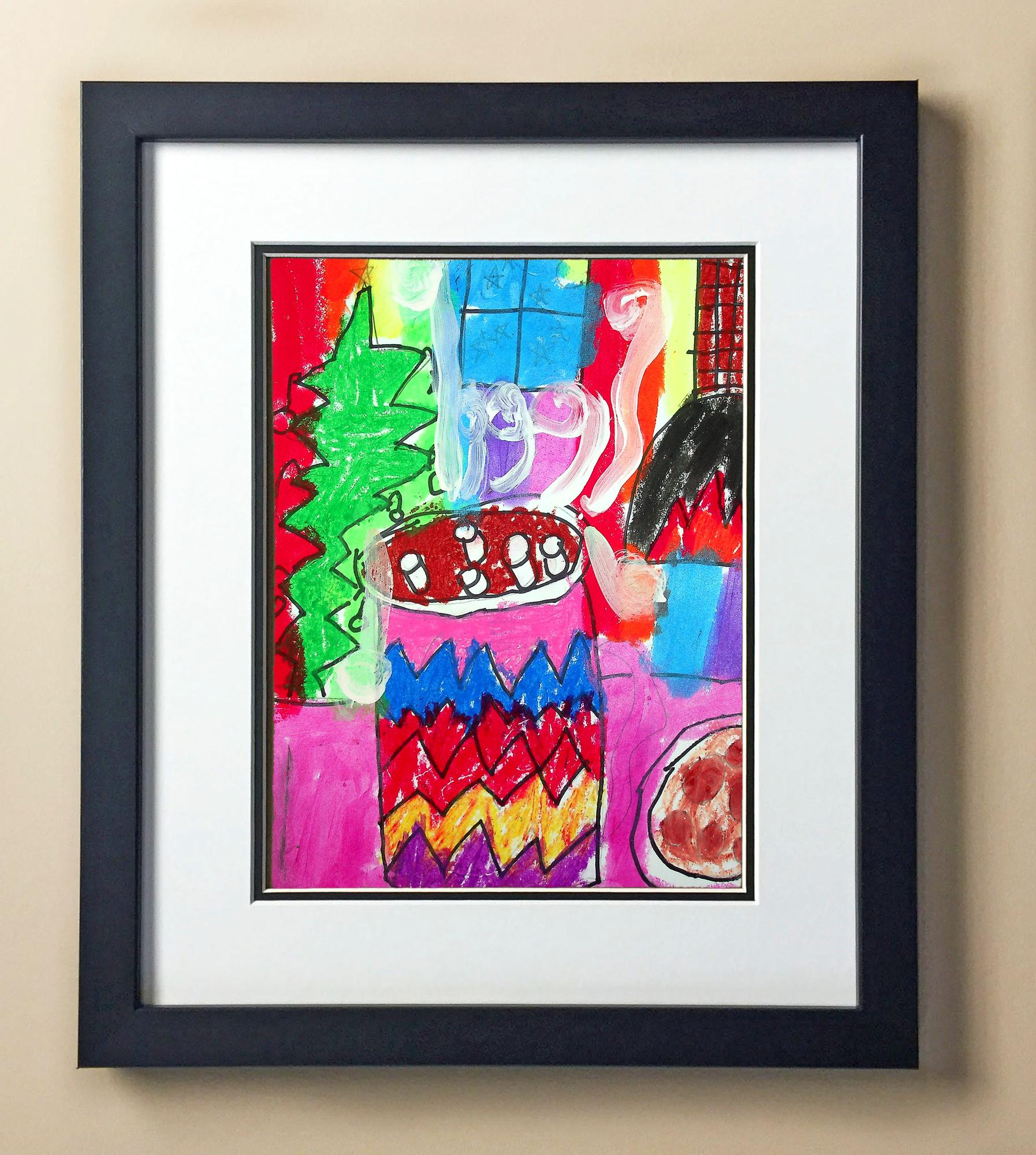 Included with the purchase is the Students Artwork, Frame, double matboard, shatter proof plexiglass, and a ready to hang backerboard with turnbuttons