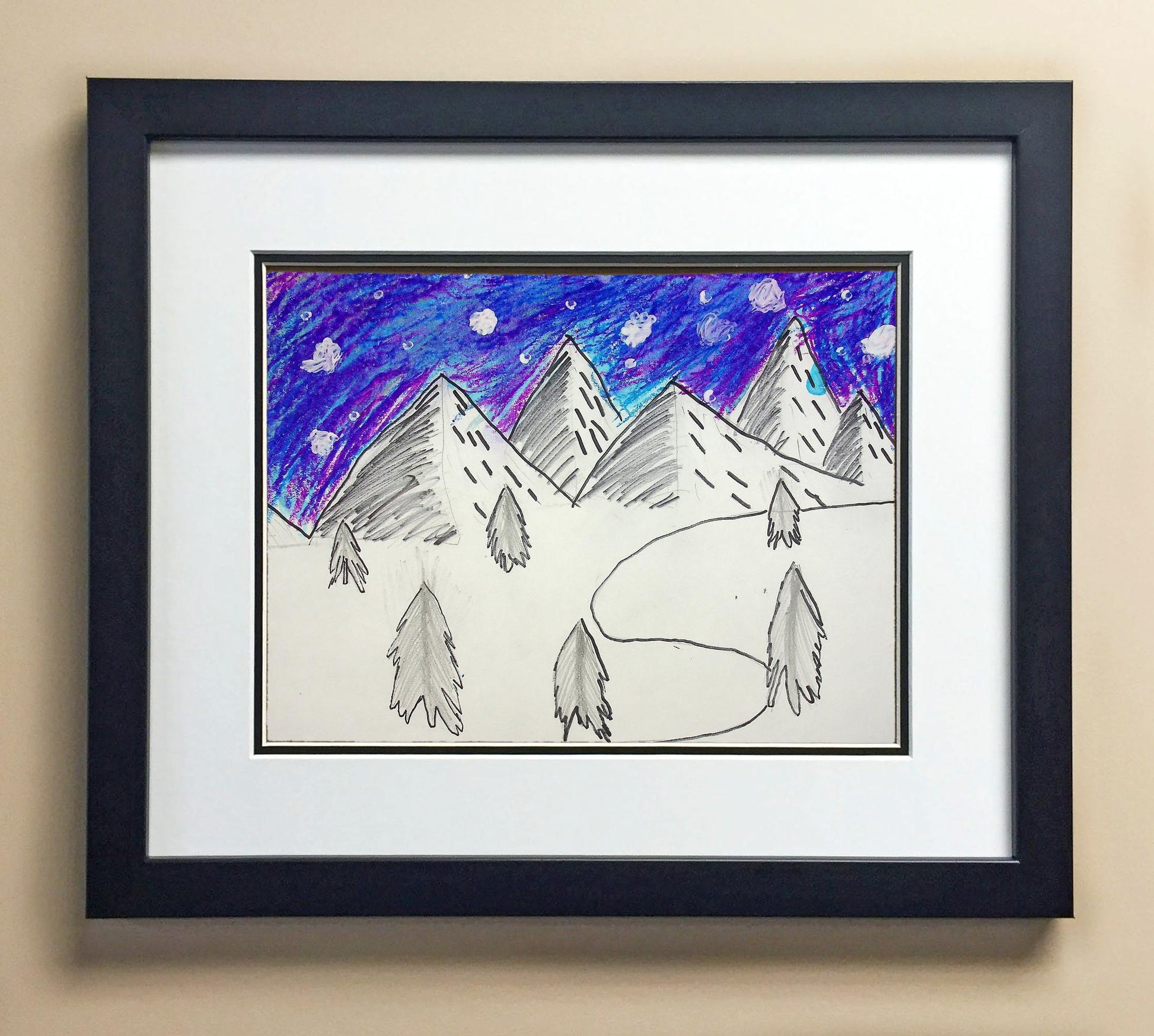 Included with the purchase is the Students Artwork, Frame, double matboard, shatter proof plexiglass, and a ready to hang backerboard with turnbuttons