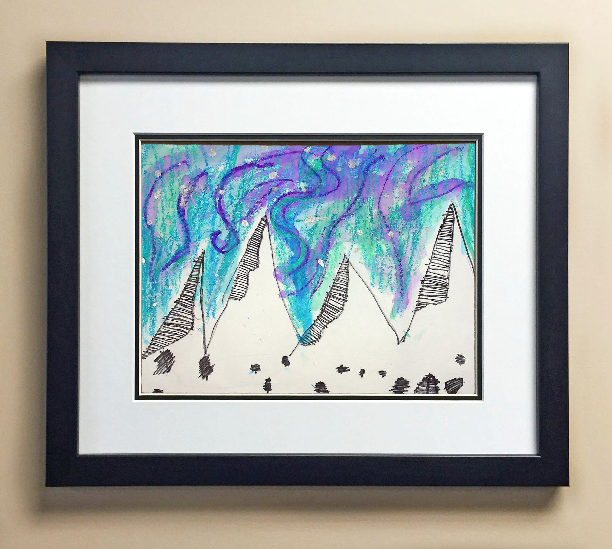 Included with the purchase is the Students Artwork, Frame, double matboard, shatter proof plexiglass, and a ready to hang backerboard with turnbuttons