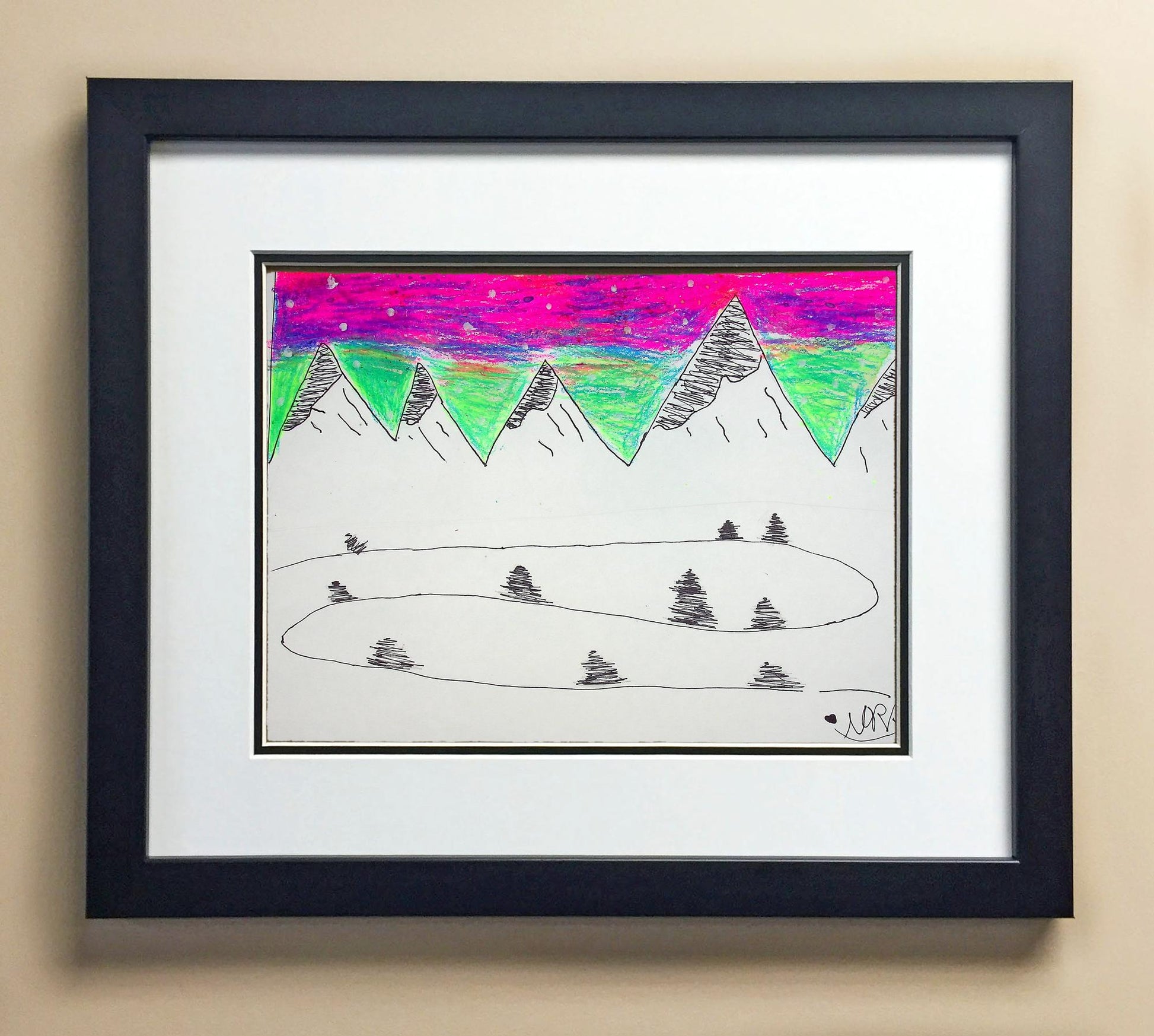 Included with the purchase is the Students Artwork, Frame, double matboard, shatter proof plexiglass, and a ready to hang backerboard with turnbuttons