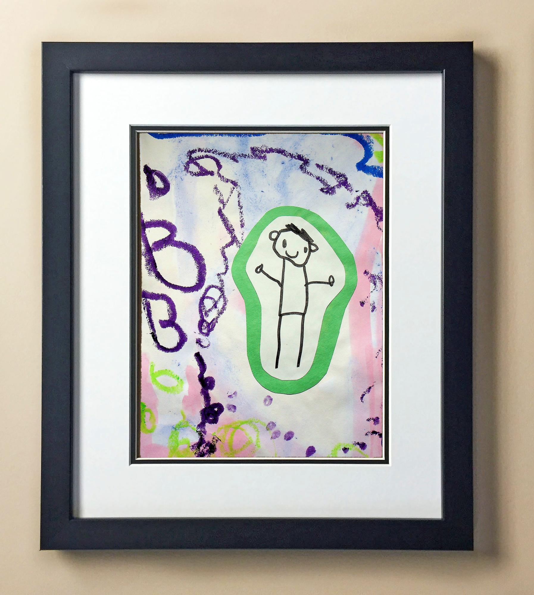 Included with the purchase is the Students Artwork, Frame, double matboard, shatter proof plexiglass, and a ready to hang backerboard with turnbuttons