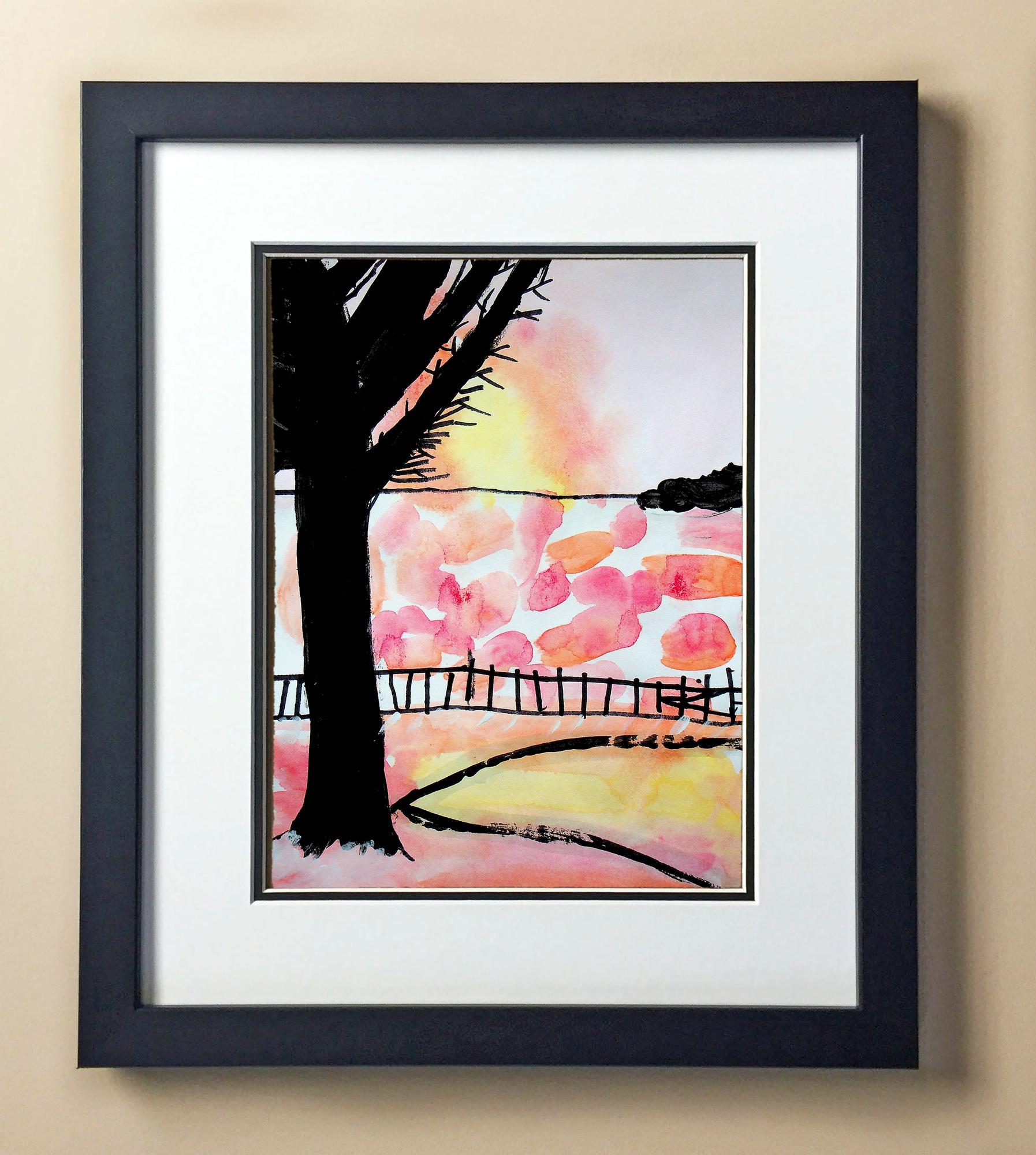 Included with the purchase is the Students Artwork, Frame, double matboard, shatter proof plexiglass, and a ready to hang backerboard with turnbuttons