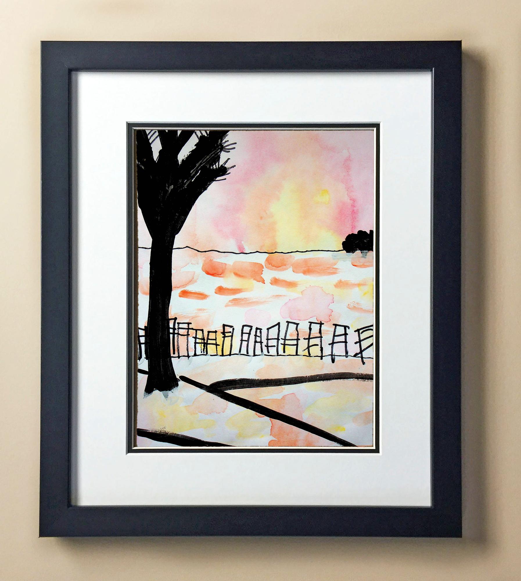 Included with the purchase is the Students Artwork, Frame, double matboard, shatter proof plexiglass, and a ready to hang backerboard with turnbuttons