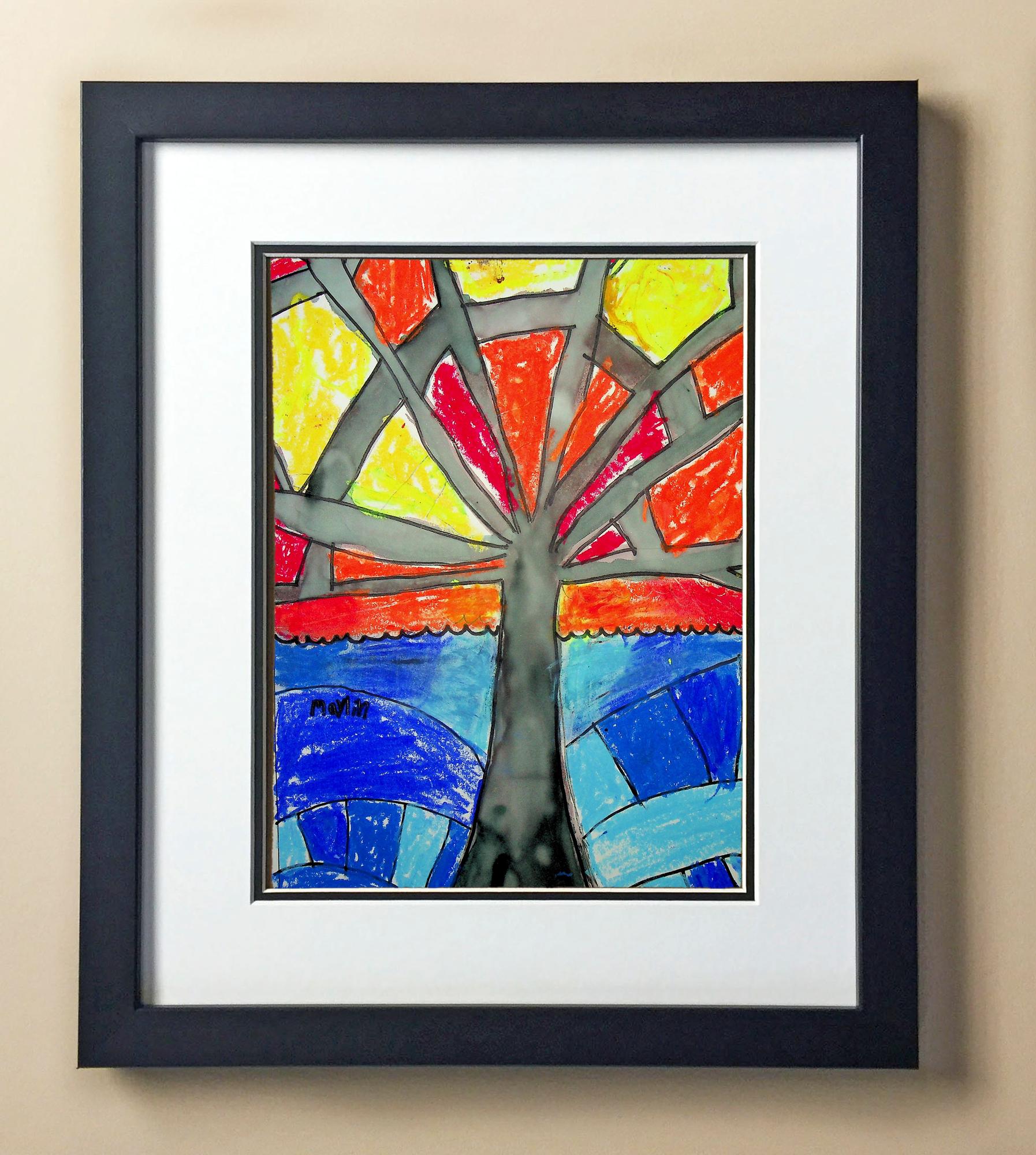 Included with the purchase is the Students Artwork, Frame, double matboard, shatter proof plexiglass, and a ready to hang backerboard with turnbuttons
