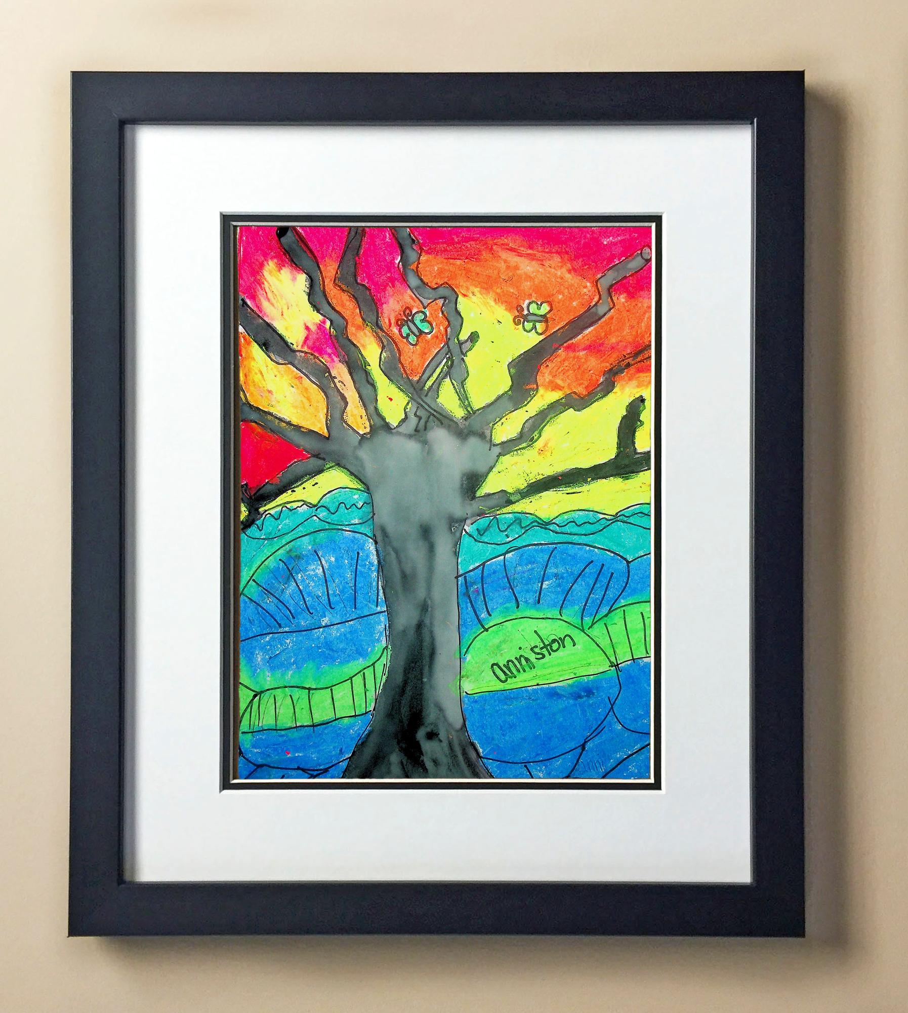 Included with the purchase is the Students Artwork, Frame, double matboard, shatter proof plexiglass, and a ready to hang backerboard with turnbuttons