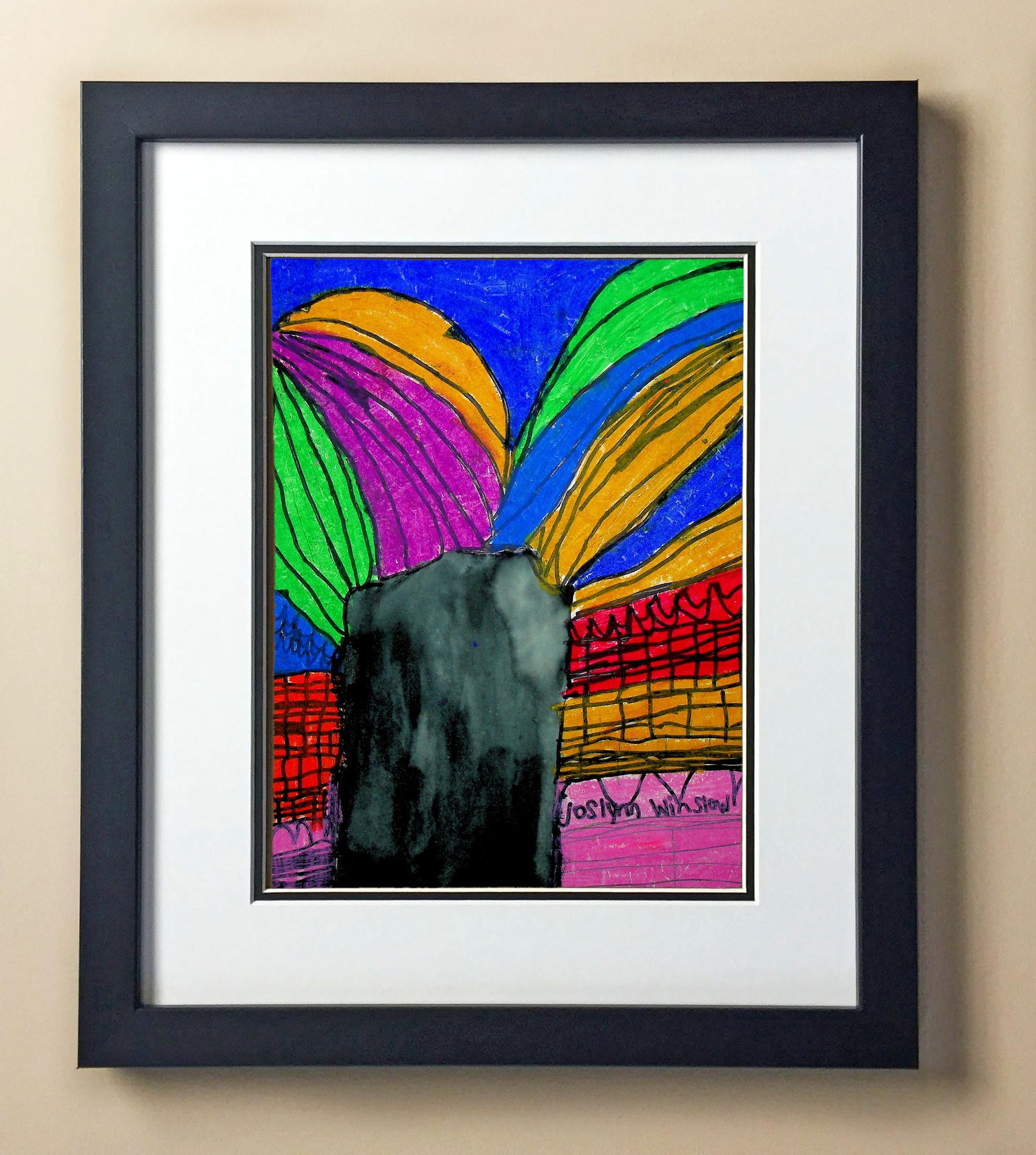 Included with the purchase is the Students Artwork, Frame, double matboard, shatter proof plexiglass, and a ready to hang backerboard with turnbuttons