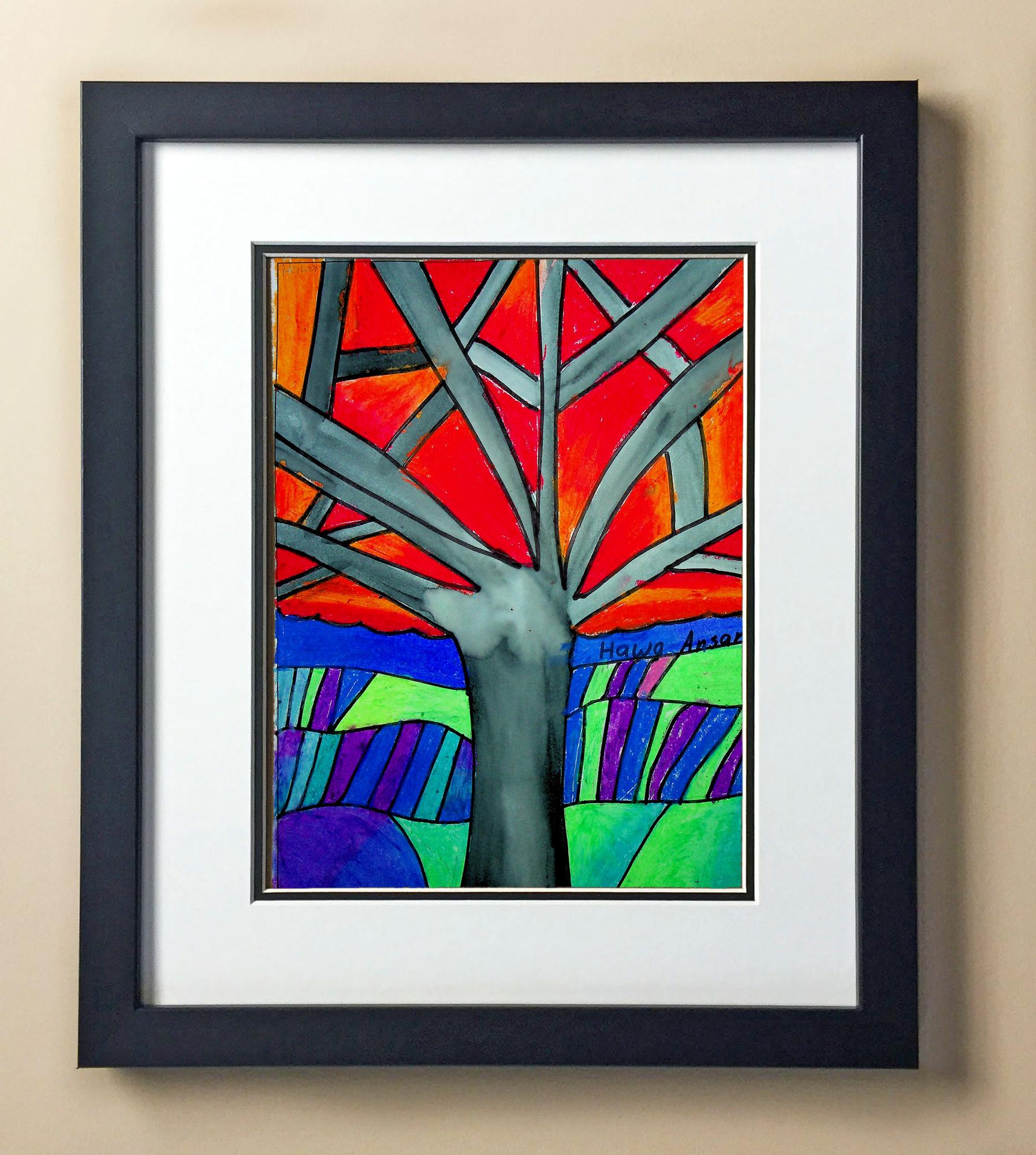 Included with the purchase is the Students Artwork, Frame, double matboard, shatter proof plexiglass, and a ready to hang backerboard with turnbuttons