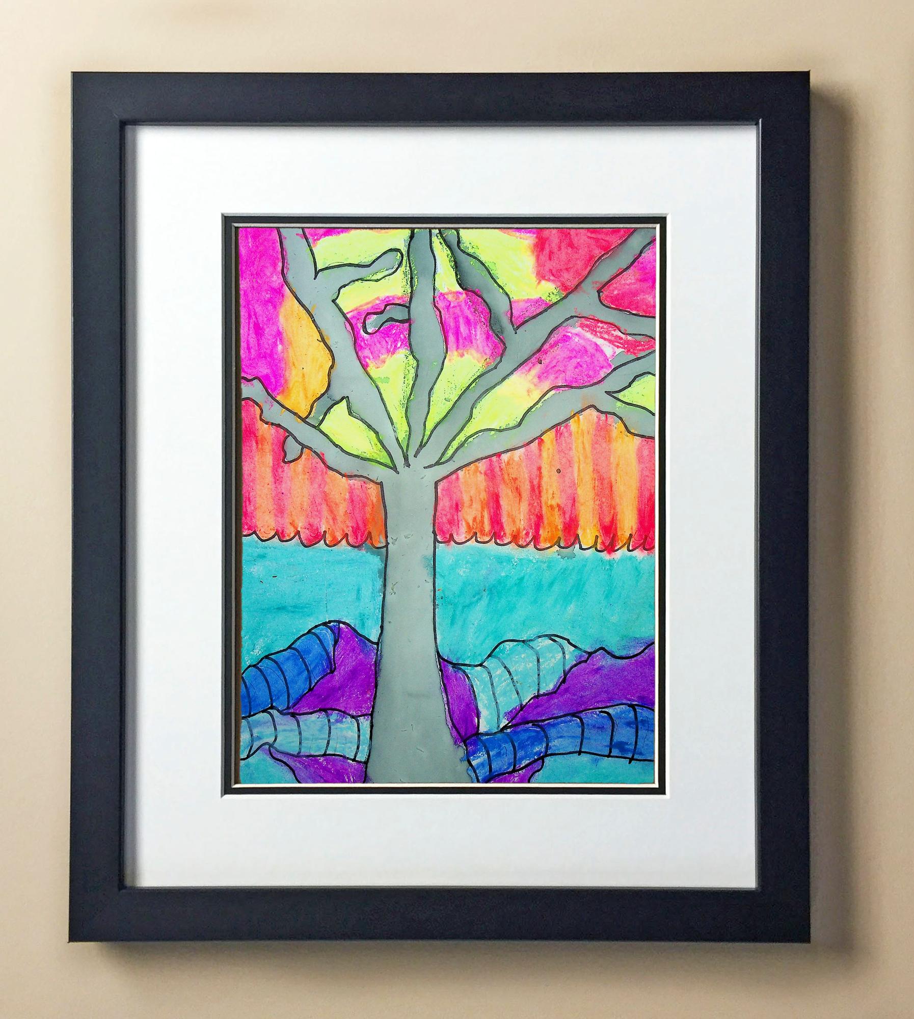 Included with the purchase is the Students Artwork, Frame, double matboard, shatter proof plexiglass, and a ready to hang backerboard with turnbuttons