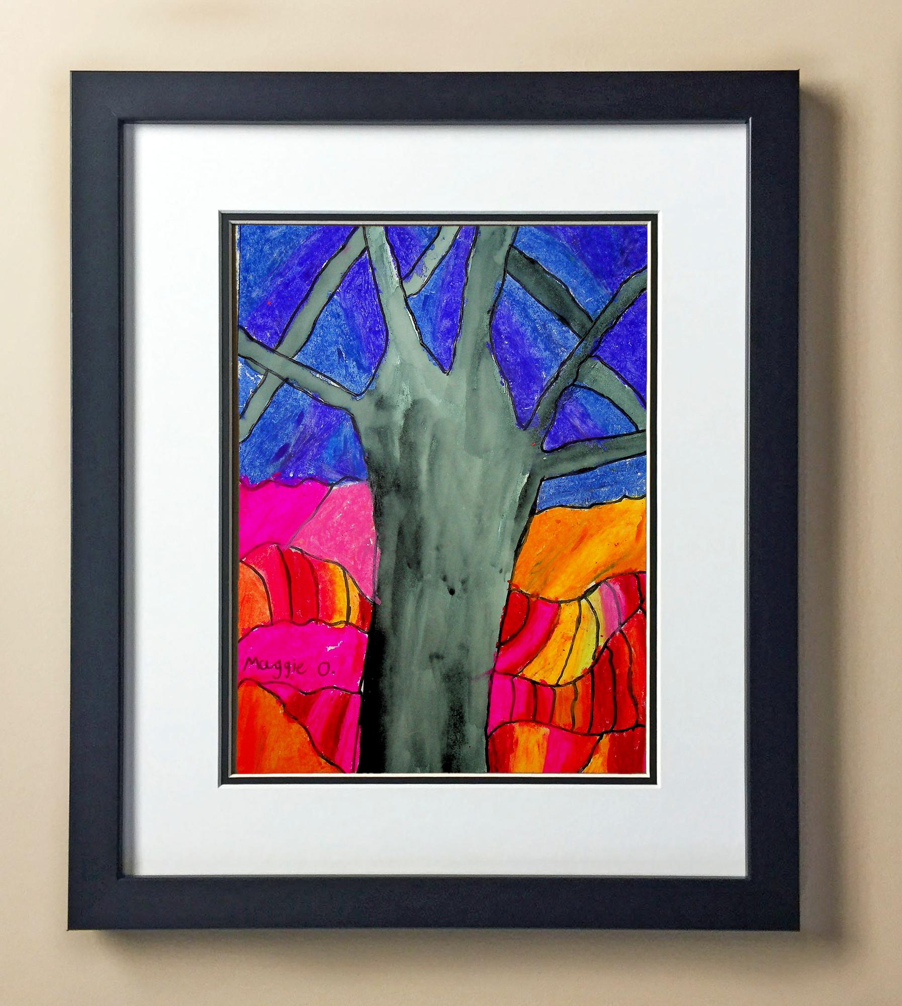 Included with the purchase is the Students Artwork, Frame, double matboard, shatter proof plexiglass, and a ready to hang backerboard with turnbuttons