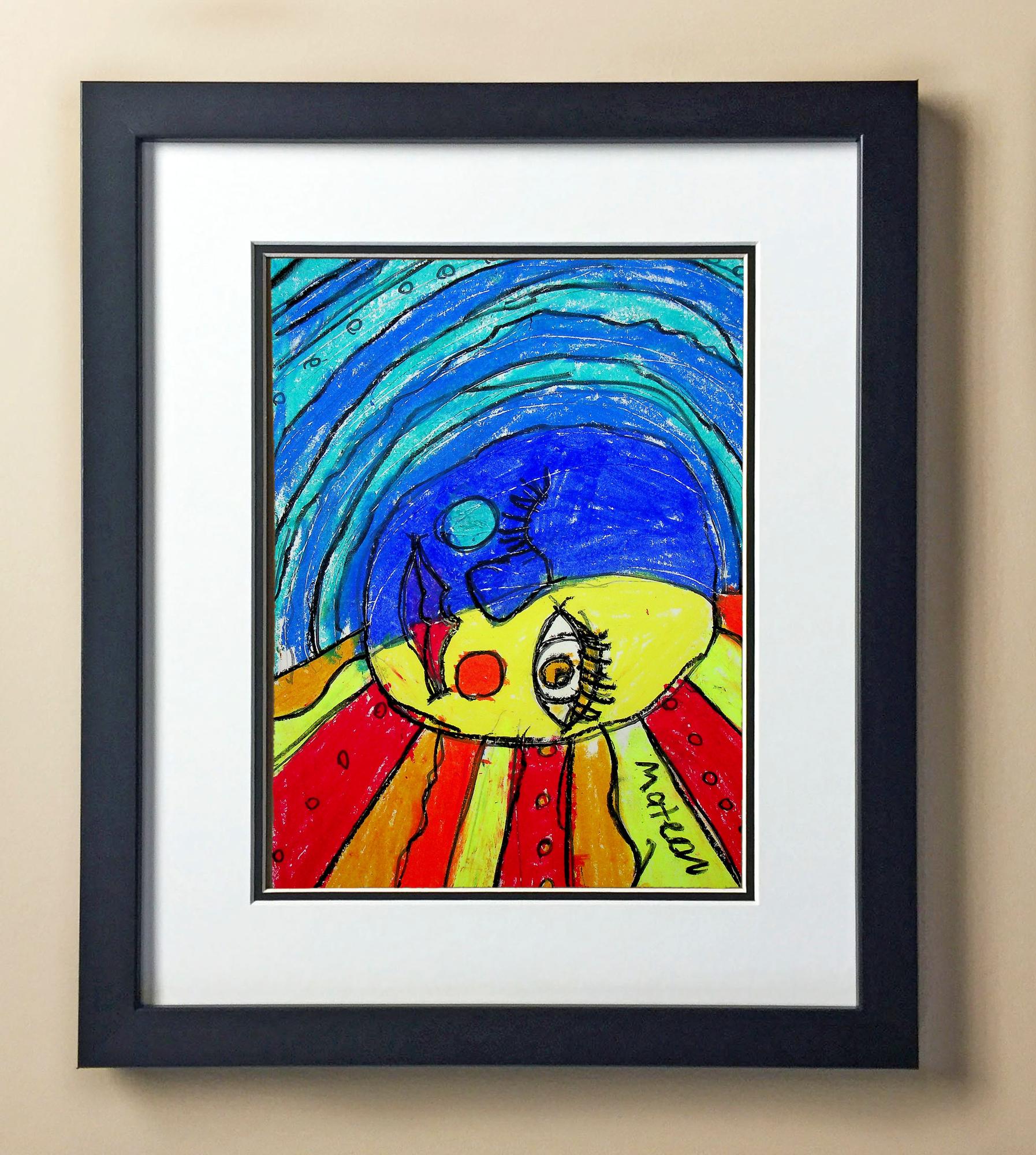 Included with the purchase is the Students Artwork, Frame, double matboard, shatter proof plexiglass, and a ready to hang backerboard with turnbuttons