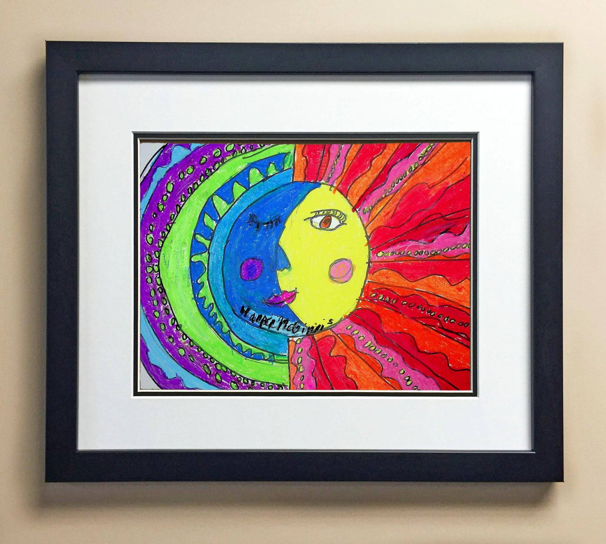 Included with the purchase is the Students Artwork, Frame, double matboard, shatter proof plexiglass, and a ready to hang backerboard with turnbuttons