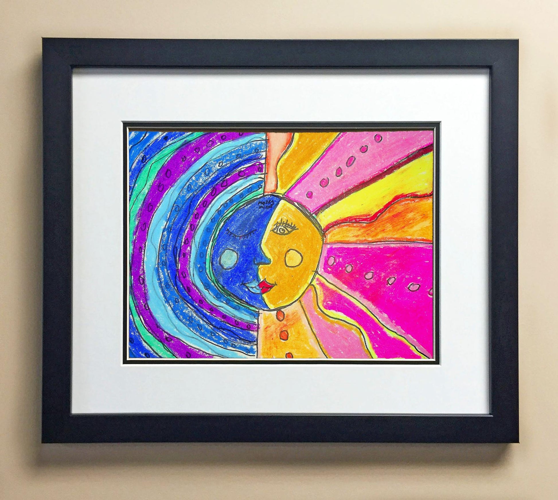 Included with the purchase is the Students Artwork, Frame, double matboard, shatter proof plexiglass, and a ready to hang backerboard with turnbuttons