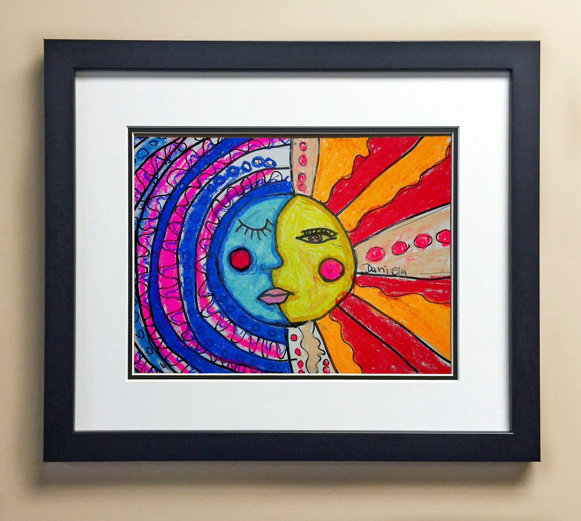 Included with the purchase is the Students Artwork, Frame, double matboard, shatter proof plexiglass, and a ready to hang backerboard with turnbuttons