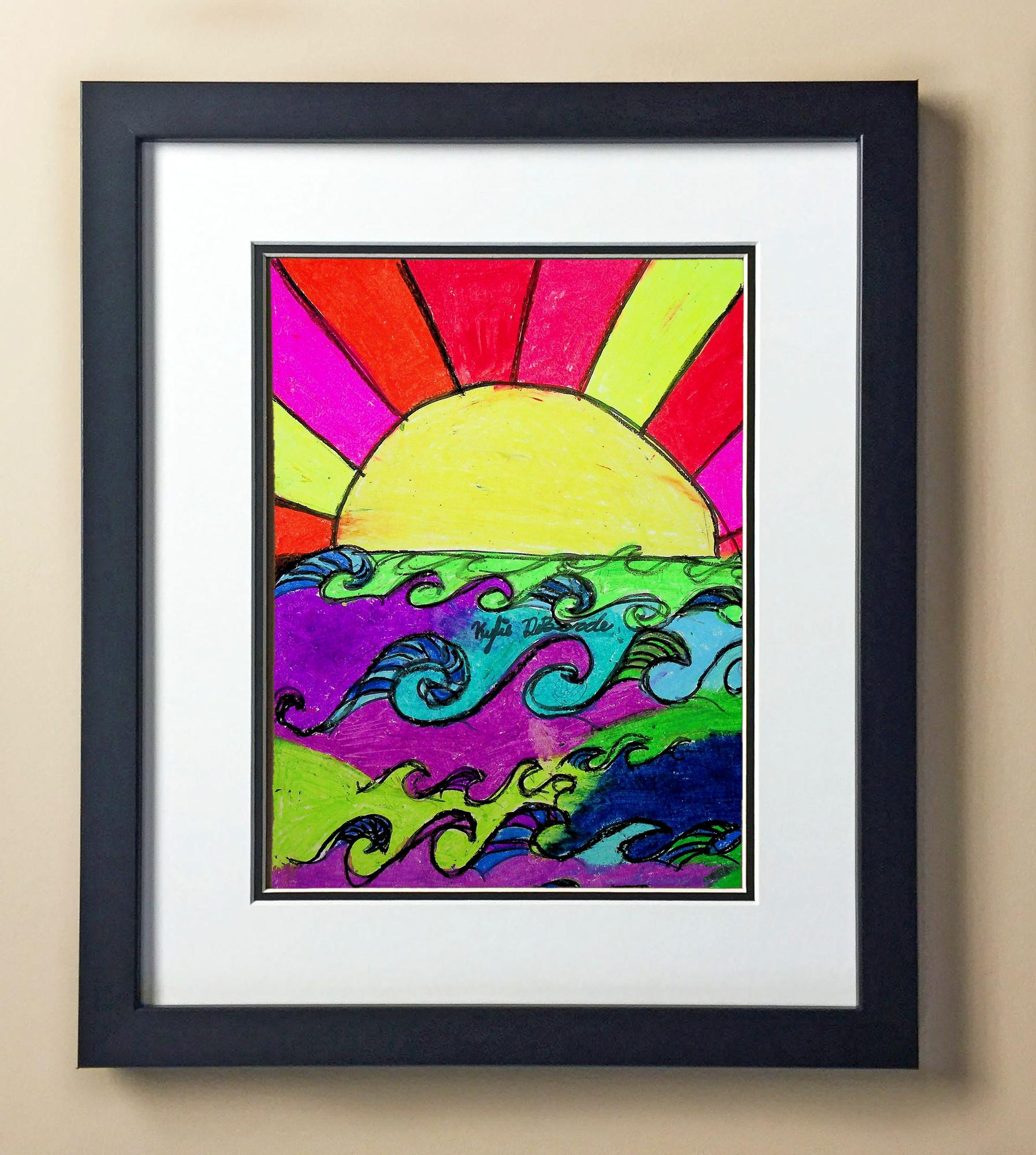 Included with the purchase is the Students Artwork, Frame, double matboard, shatter proof plexiglass, and a ready to hang backerboard with turnbuttons