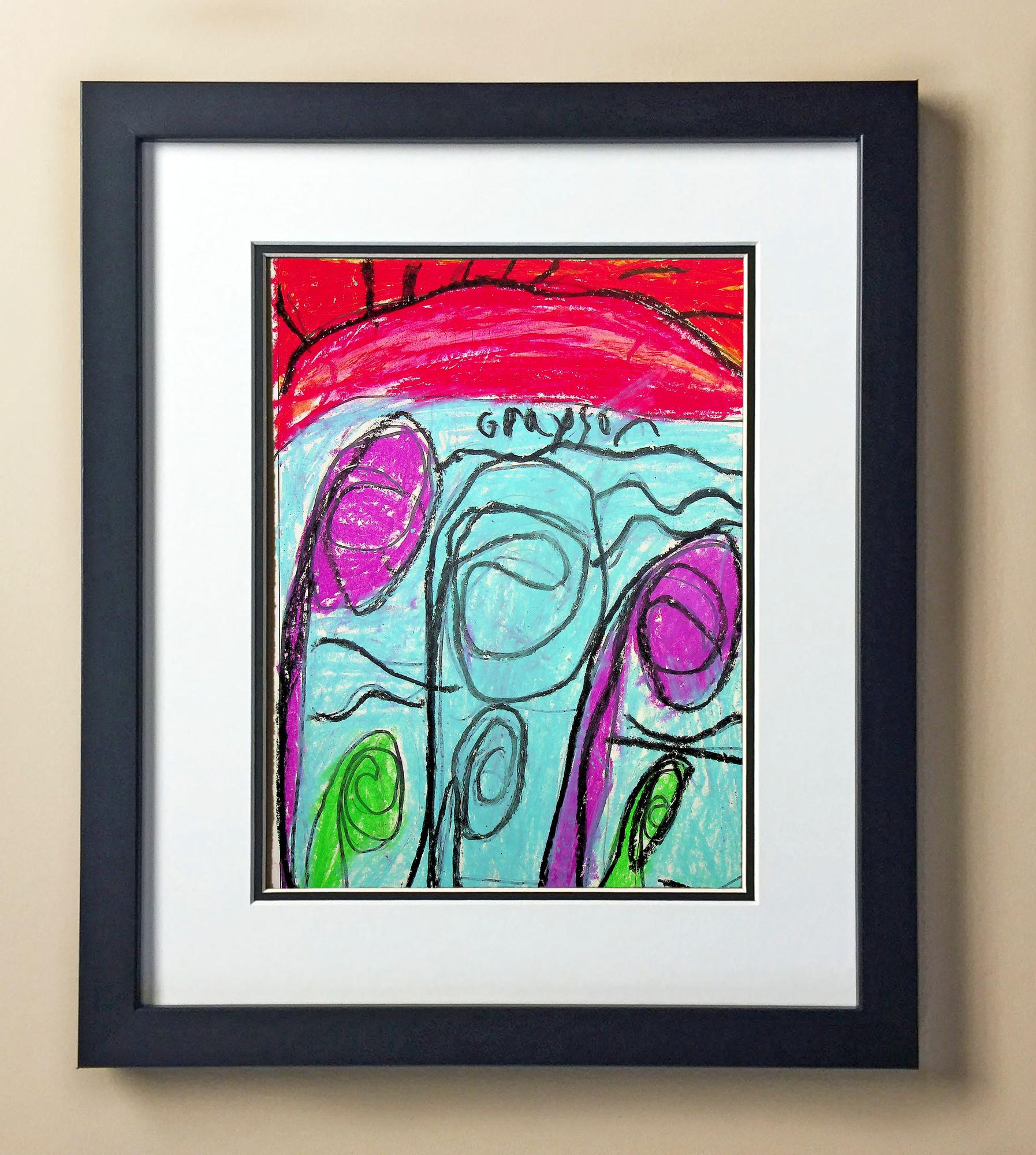 Included with the purchase is the Students Artwork, Frame, double matboard, shatter proof plexiglass, and a ready to hang backerboard with turnbuttons