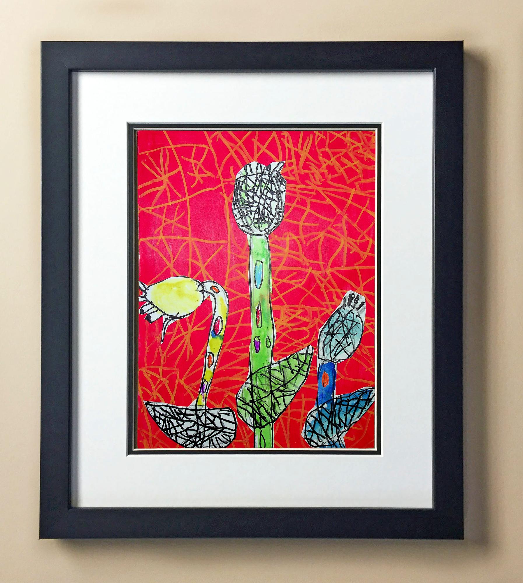 Included with the purchase is the Students Artwork, Frame, double matboard, shatter proof plexiglass, and a ready to hang backerboard with turnbuttons