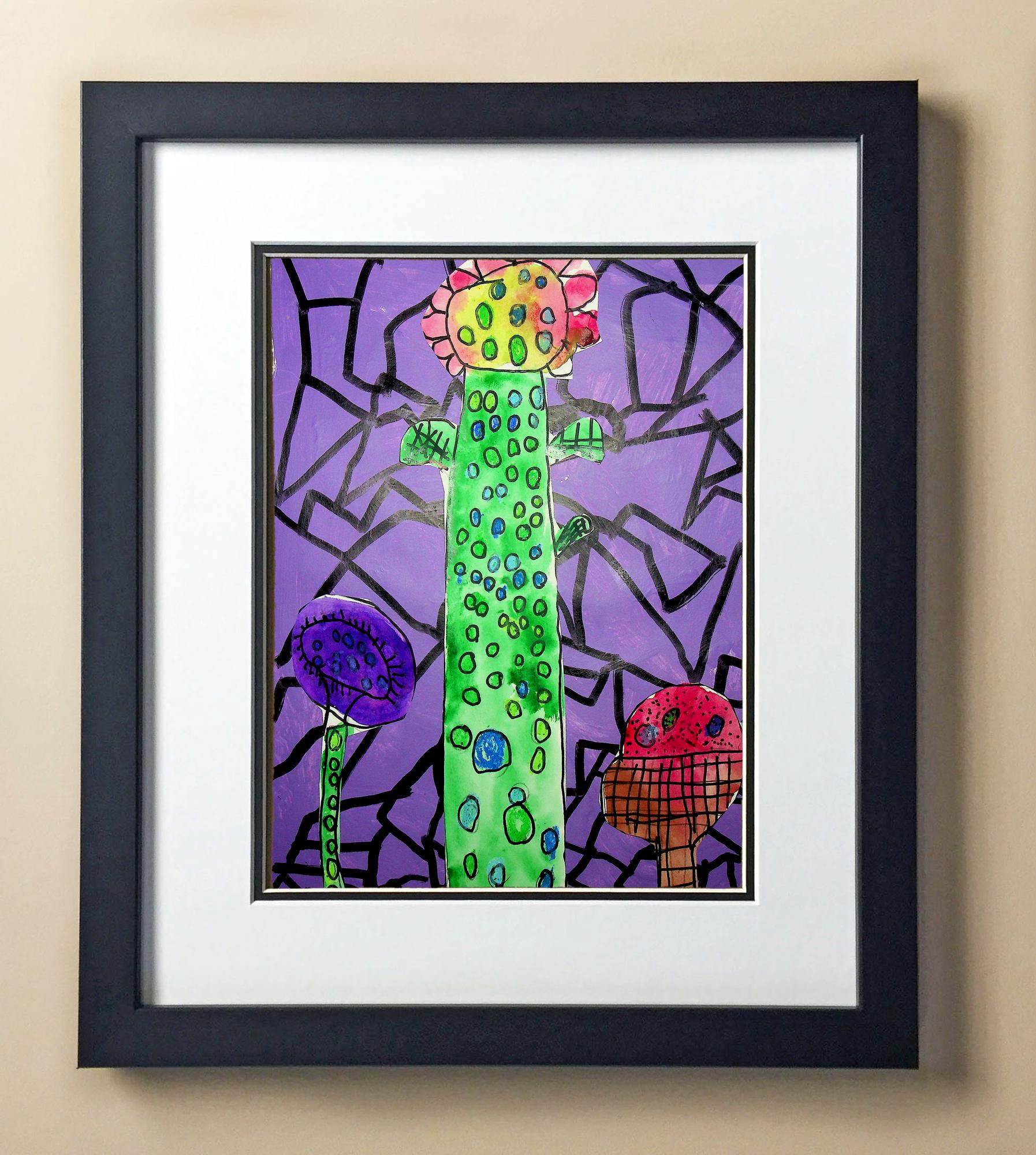 Included with the purchase is the Students Artwork, Frame, double matboard, shatter proof plexiglass, and a ready to hang backerboard with turnbuttons