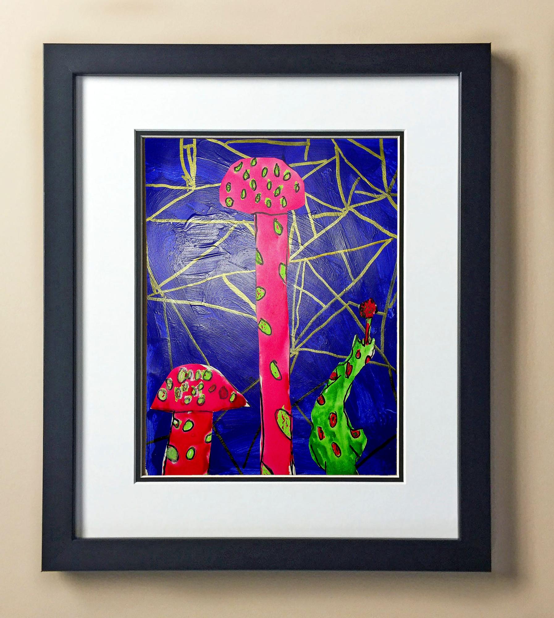 Included with the purchase is the Students Artwork, Frame, double matboard, shatter proof plexiglass, and a ready to hang backerboard with turnbuttons